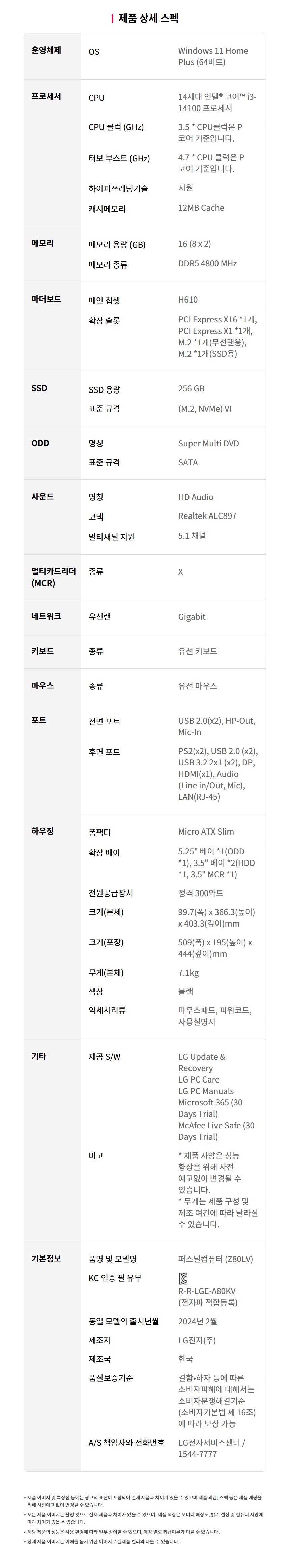 LG 슬림 PC Z80LV.AA4331 i3-14100 16G 256G ODD 슬림 WIN11