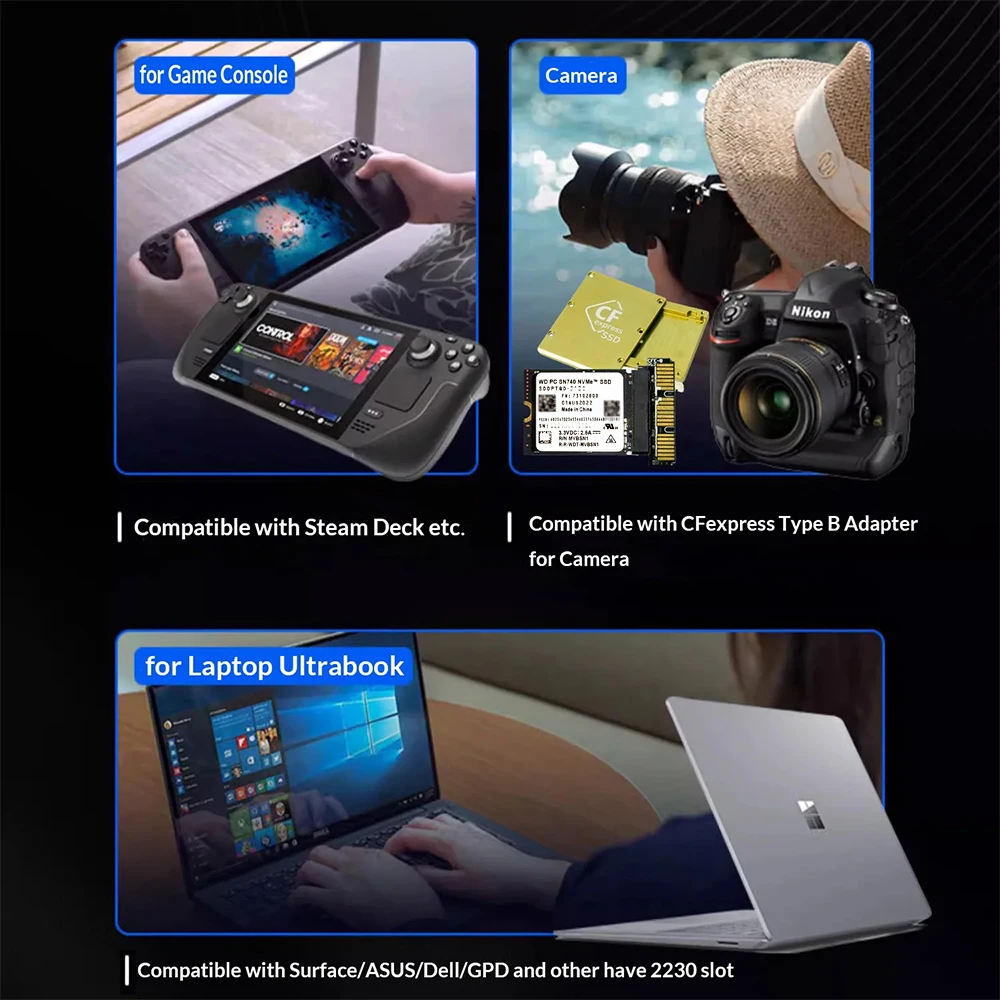 스팀 데크에도 딱 맞는 (22mm x 30mm) 는 스팀 데크 및 표면과 호환됩니다 (SP8 과 작동하지 않음) 노트북 게임 그래픽 데이터 분석에서 강력한 응용 프로그램을 위해 지속적인 고성능 대역폭 및 량으로 완전히 몰입 형 게임 플레이를 달성하십시오