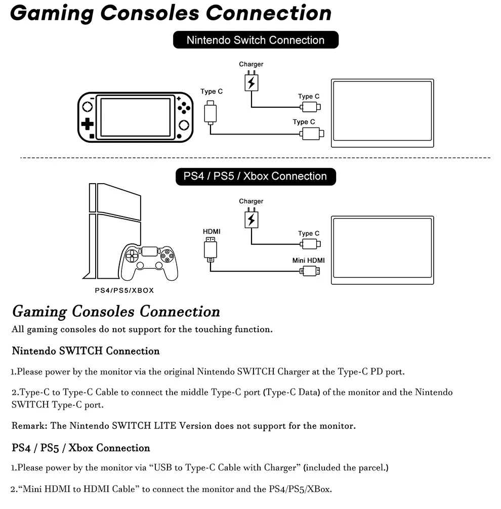 첫째 스위치 컨트롤러를 떼어냅니다 둘째 모니터 유형 C PD 충전 포트를 SWITCH 충전기와 연결 마지막으로 유형 c 유형 c 케이블을 사용하여 스위치와 모니터 유형 C 데이터 포트를 연결