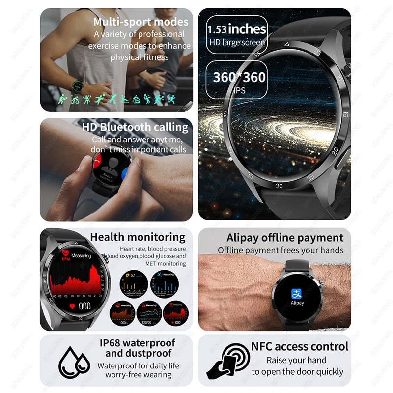 Dear friend thank you very much for your support this is a multifu ional GPS sports smart watch The duct has ma very useful fu ions For example the NFC fu ion you can open the door th gh the watch Bluetooth calling fu ion after connecting the Bluetooth of the mobile phone you can make calls directly AI voice assistant fu ion open the fu ion of the watch th gh voice There are also some medical fu ions to monitor heart rate blood pressure and keep an eye on your health All are very useful fu ions