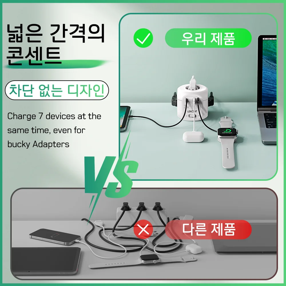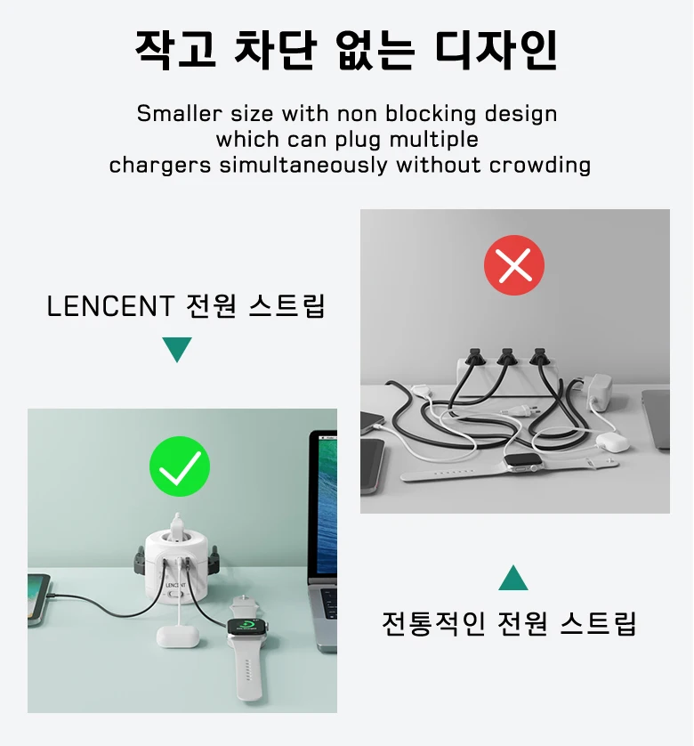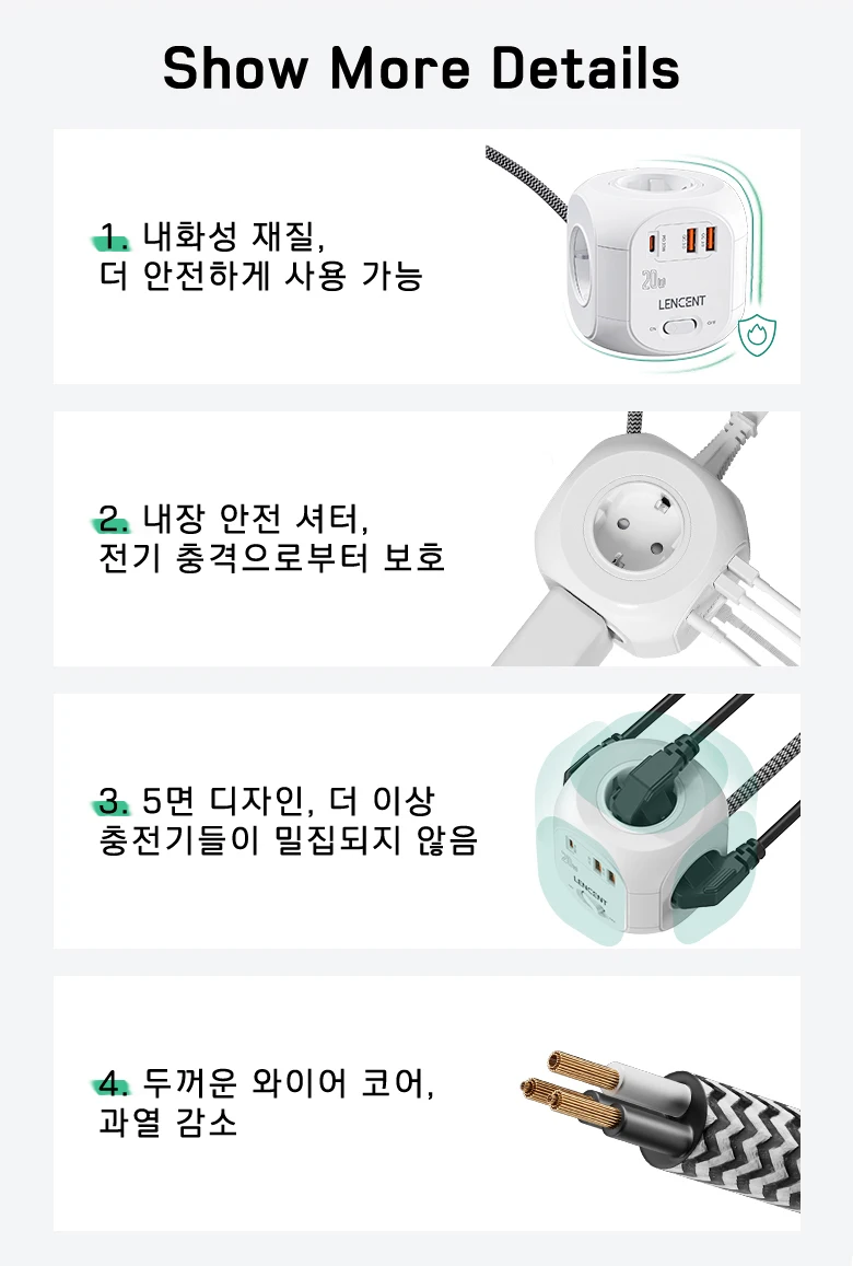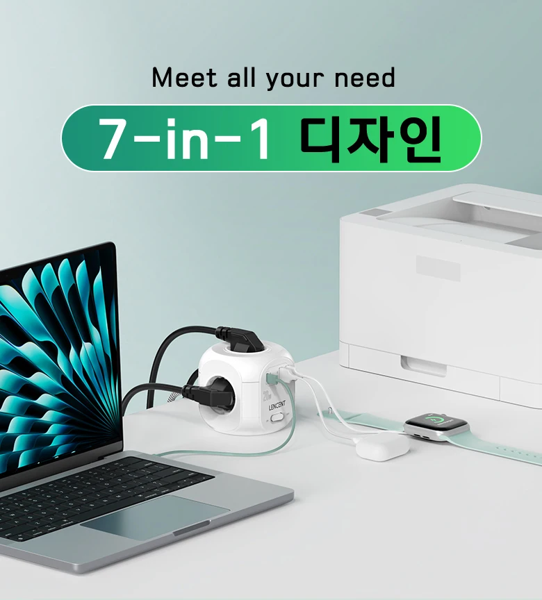 플러그 소켓 디자인으로 인접한 소켓의 사용을 방해하지 않고 대형 소켓 4개 USB 포트 2개 Type C 포트 1개를 동시에 연결
