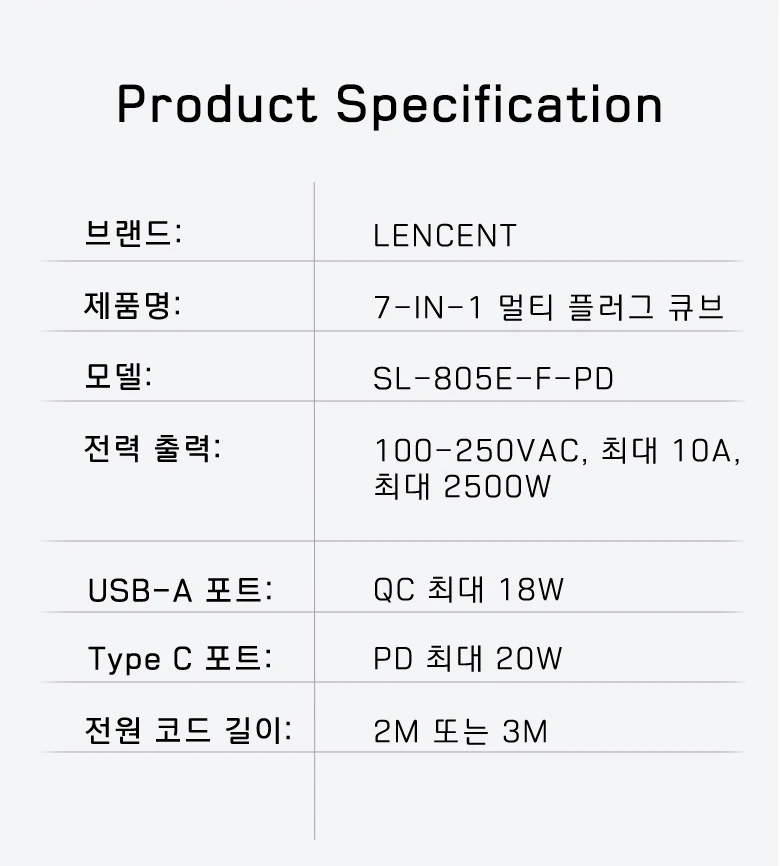 AC 플러그 최대 전력은 2500와트(최대250V 10A) 이 멀티탭을 사용하면 집과 사무실 등에서 사용 USB 포트 입력 전압 100V 250V AC 50/60Hz 0 4A USB 출력 최대 18W 유형 C 포트 최대 20W
