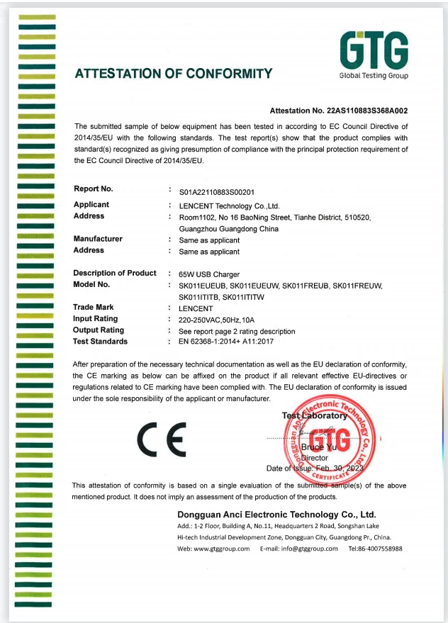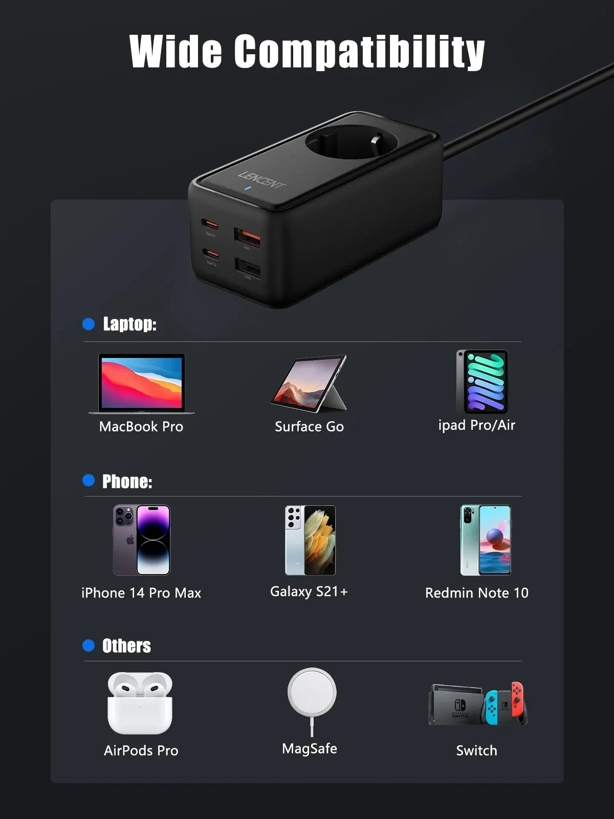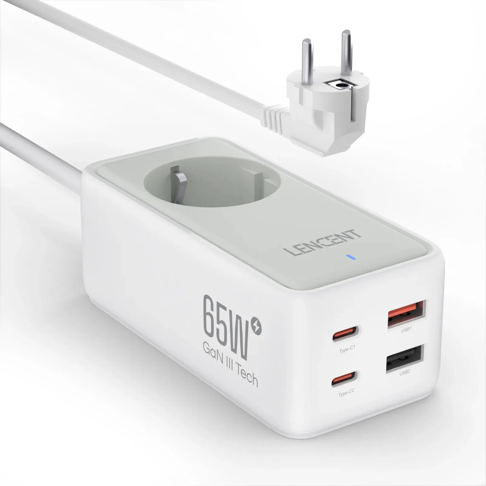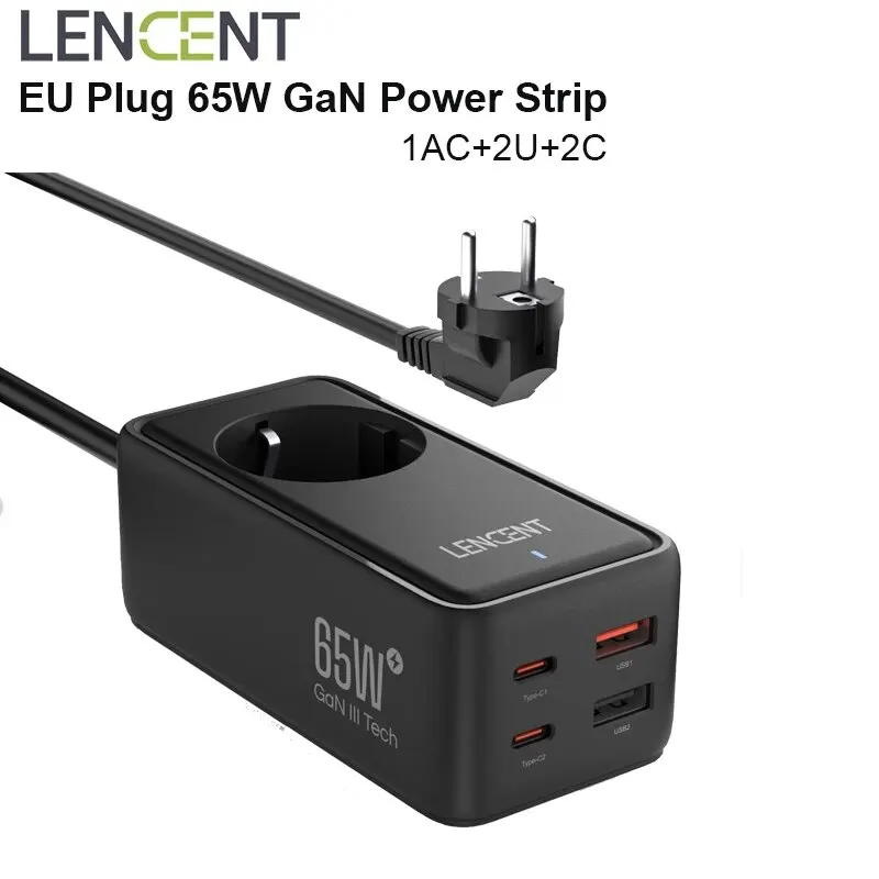 충전을 위한 자동 ID 기술 2 USB 포트 및 2 Type C 포트가있는 LENCENT 65W GaN3 데스크탑 전원 스트립은 연결된 장치를 지능적으로 식별하고 최적의 충전 전류를 감지하고 전달 빠르고 안전한 충전을
