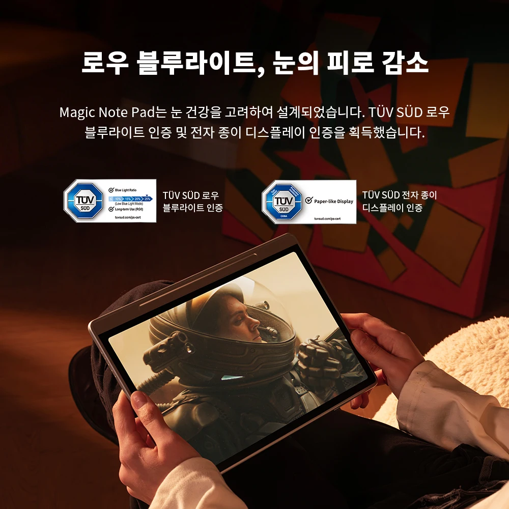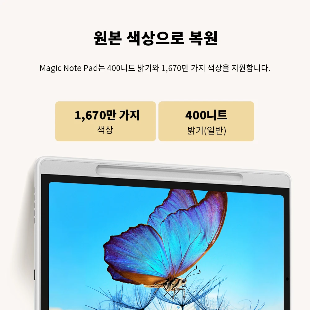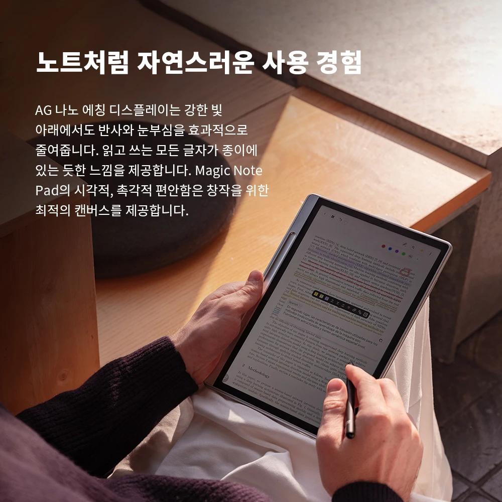 AG 나노 에칭 디스플레이는 강한 빛 아래에서도 반사와 눈부심을 효과적으로 줄여줍니다 읽고 쓰는 모든 글자가 종이에 있는 듯한 느낌을 제공 Magic Note Pad의 시각적 촉각적 편안함은 창작을 위한 최적의 캔버스를 제공