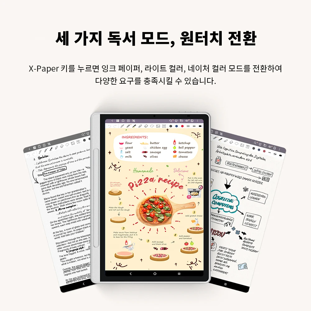 X Paper 키를 눌으면 잉크 페이퍼 라이트 컬러 네이처 컬러 모드를 전환하여 다양한 요구를 충족시킬 수