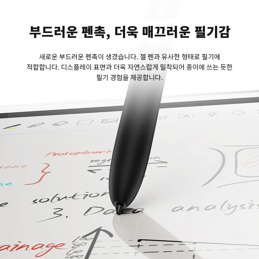 새로운 부드러운 펜촉이 생겼습니다 젤 펜과 유사한 형태로 필기에 디스플레이 표면과 더욱 자연스럽게 밀착되어 종이에 쓰는 듯한 필기 경험을 제공