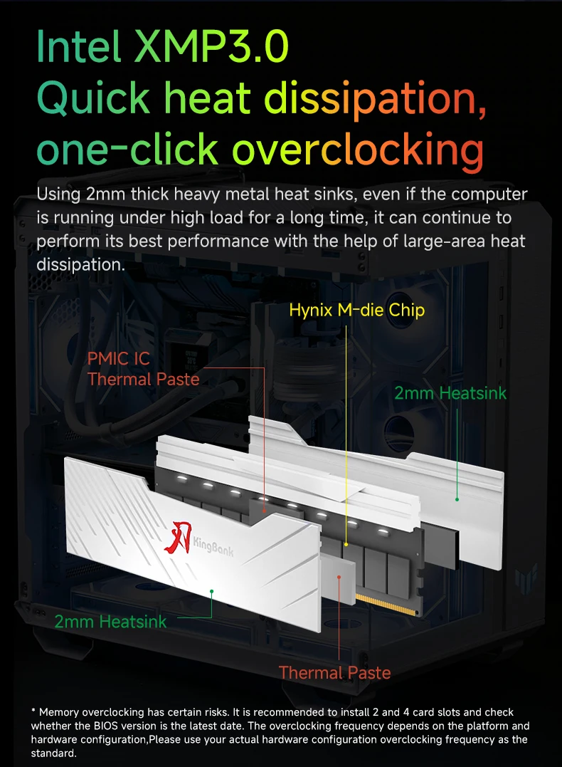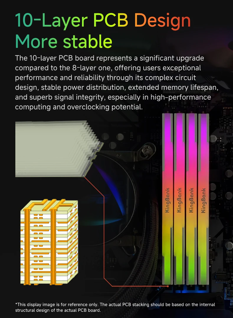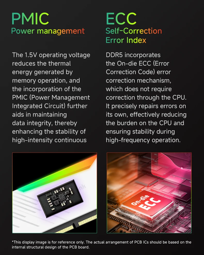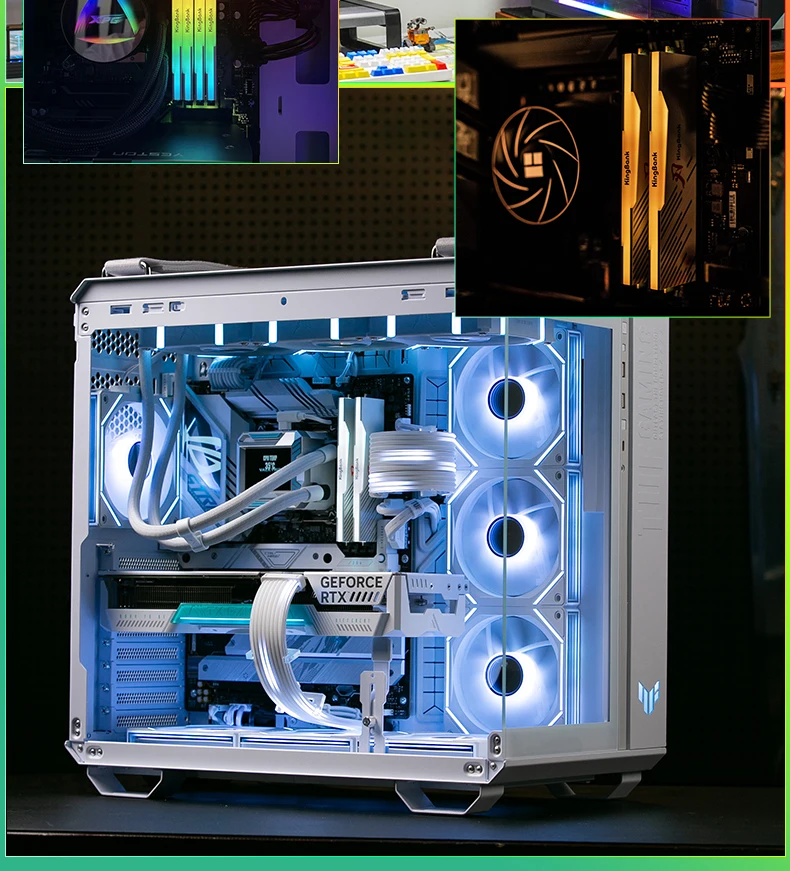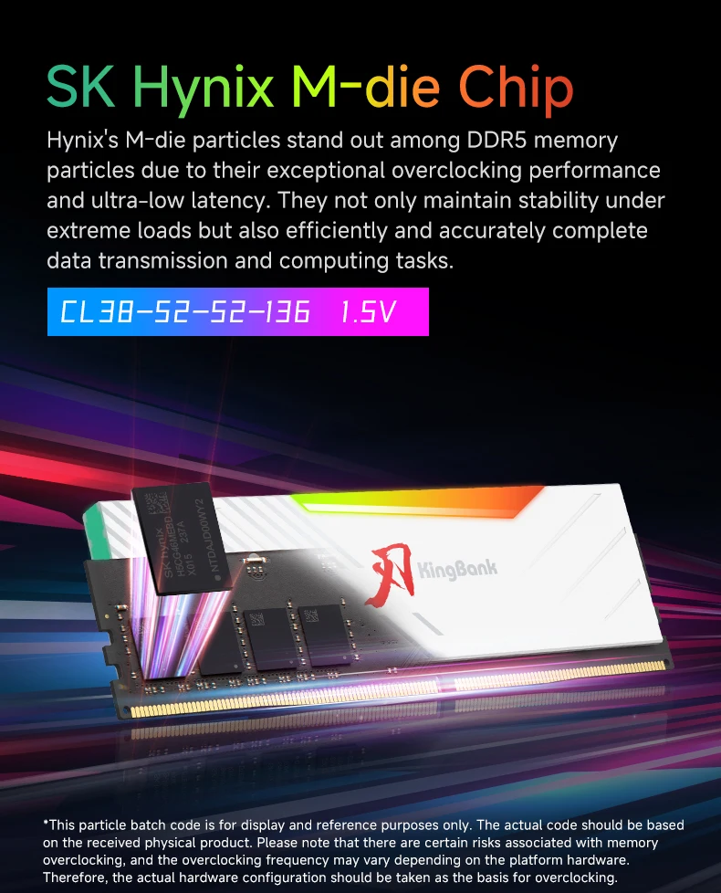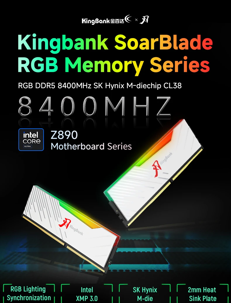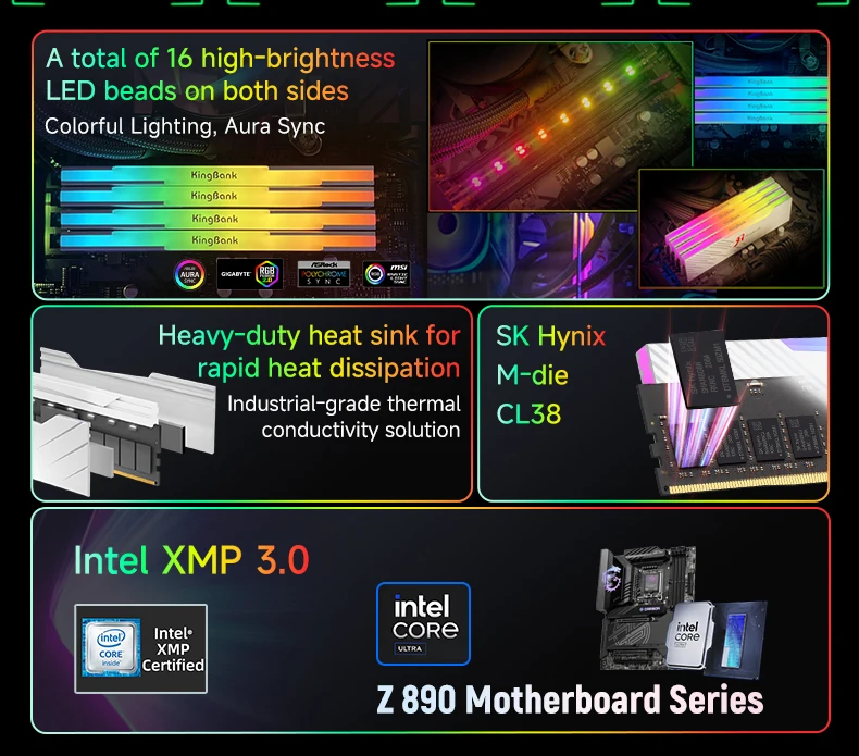 KingBank SharpBlade DDR5 RGB 게이밍 메모리는 최대 8400MT/s까지 각 288핀 M에는 P C(Power Management IC)와 ECC( Correcting Code)가 탑재되어 보다 안정적인 성능과 고속 작동이 가능 메모리 모듈은 MSI 및 와 같은 마더보드와 동기화된 조명을 지원 원래 생산된 IC 및 기타 부품을 선택하여 모듈은 호환성 신뢰성 및 전반적인 성능에 대한 엄격한 테스트를 거쳤습니다
