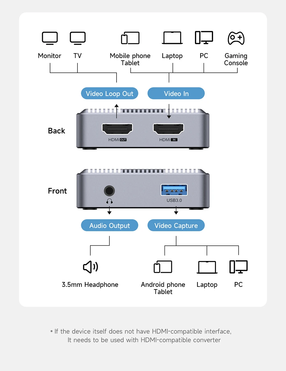 널리 사용 sp USB C 비디오 캡처 카드는 비디오와 오디오를 동시에 캡처하고 미리보기 및 저장을 위해 오디오 및 비디오 신호를 컴퓨터나 스마트폰으로 전송 따라서 이 HD 캡처 카드는 고화질 획득 라이브 방송 회의실 비디오 녹화 교육 영상 게임 엔터테인먼트 라이브 방송 등에 이 장치는 USB C 인터페이스가 있는 Android 태블릿을 지원하지만 는 지원하지 않습니다 현재 지원