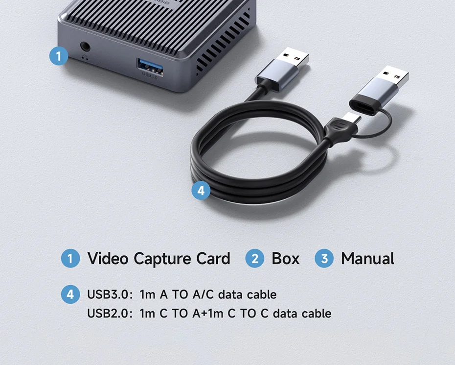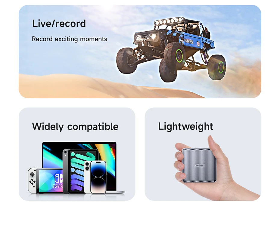 플러그 앤 플레이 sp 드라이버가 필요 없는 휴대용 HD 비디오 캡처 카드이므로 드라이버와 외부 전원 공급 장치 없이 사용 따라서 현재 소프트웨어에 내장된 기능을 사용하여 원활한 경험을 얻을 수 그리고 캡처카드는 가 작아 휴대가 간편해 야외 및 실내 라이브 방송에 문제가 없습니다 게다가 무게도 약 4 에 불과해 휴대성이 뛰어납니다