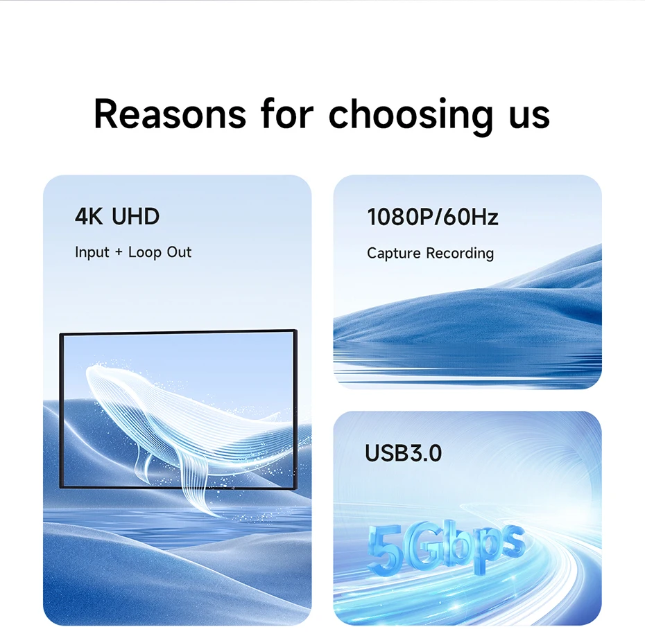 1080P 60Hz/30Hz 비디오 녹화 비디오 캡처 카드는 최대 4K 60Hz 고화질 입력 출력 최대 해상도 1920×1080입니다 1080P 녹화 및 라이브 스트리밍을 제공 오디오 비디오 캡처 카드는 OBS AMCap Xsplit VCL 등의 1080P 고해상도로 게임 녹화 편집 및 전송에 매우