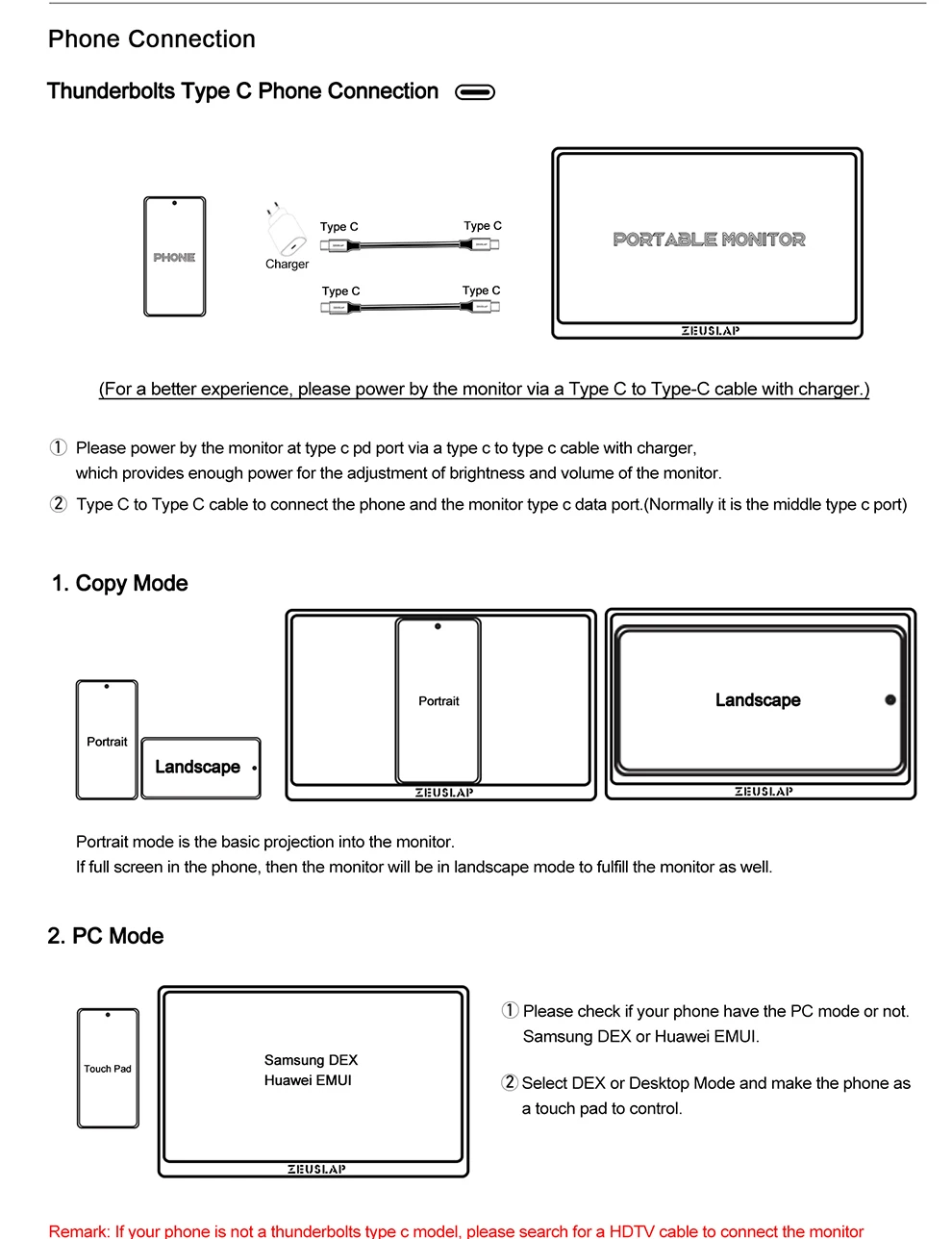 질문 1 내 휴대전화가 Thunderbots Type C 휴대전화가 아닌 경우 ZEUSLAP 휴대용 모니터와 어떻게 작동하나요