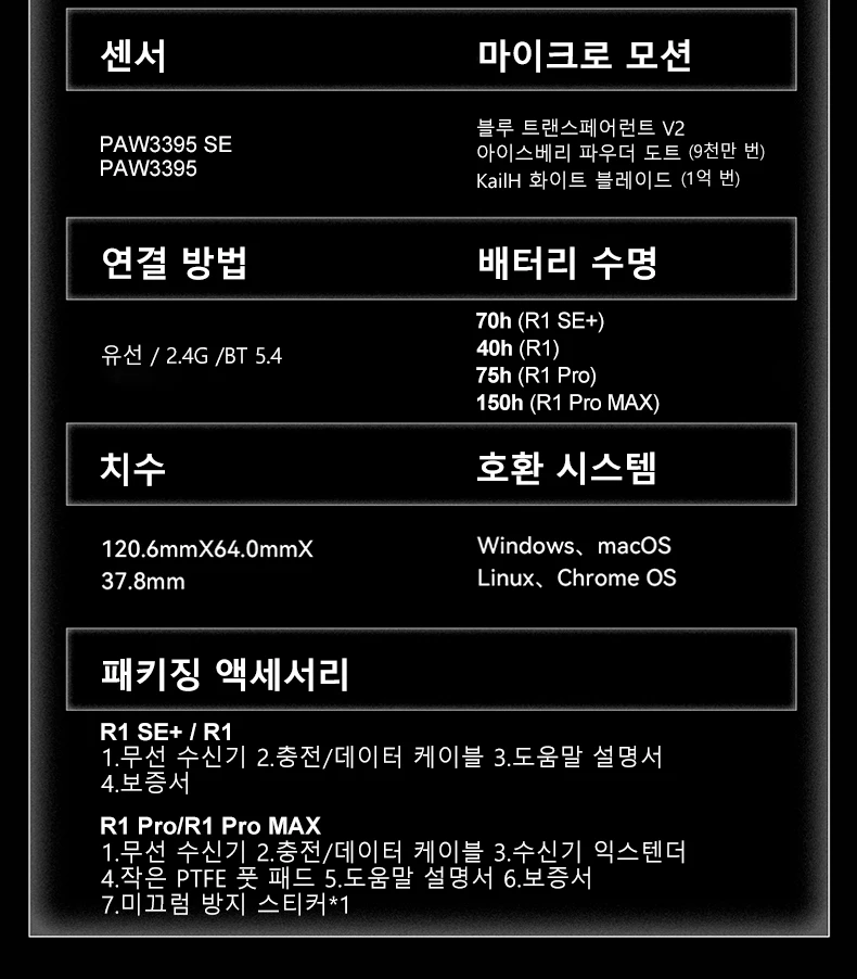 색상 : R1 (Bla ) 2 ![]() | 색상 : R1 (White) 2 ![]() | 색상 : R1 MAX (Bla ) ![]() |