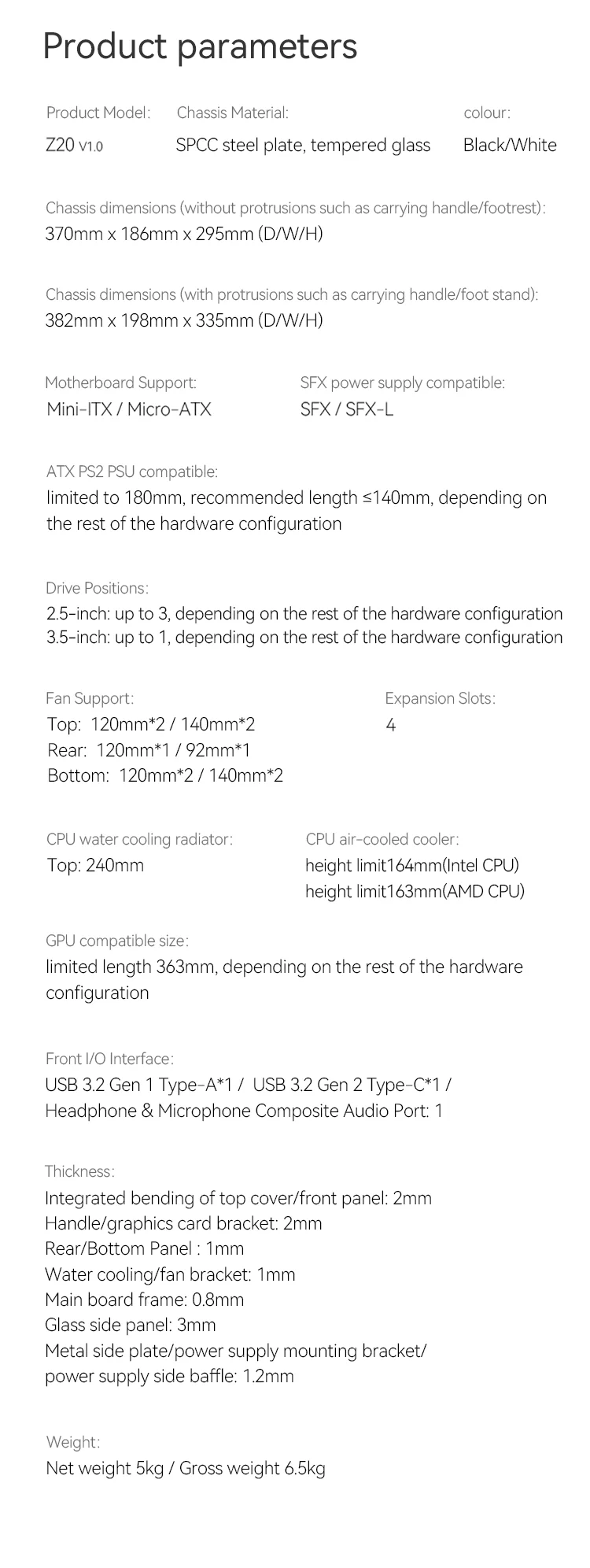 JONSBO Z20 화이트 블랙 MATX ATX 섀시 20L 분리형 핸들 케이스 163mm 공냉식 그래픽 카드 Type C 데스크탑 작은 공간