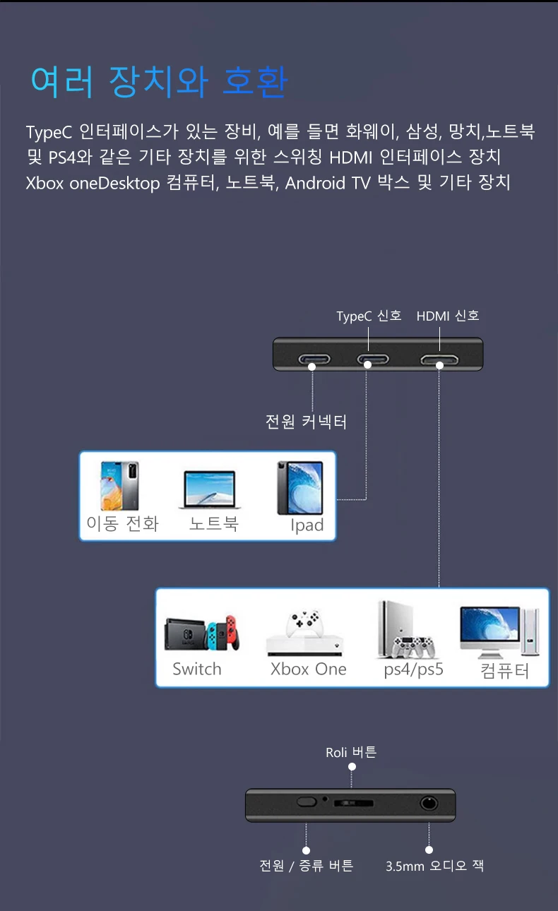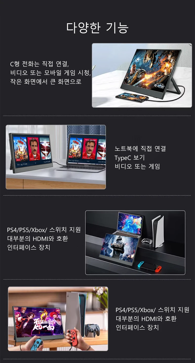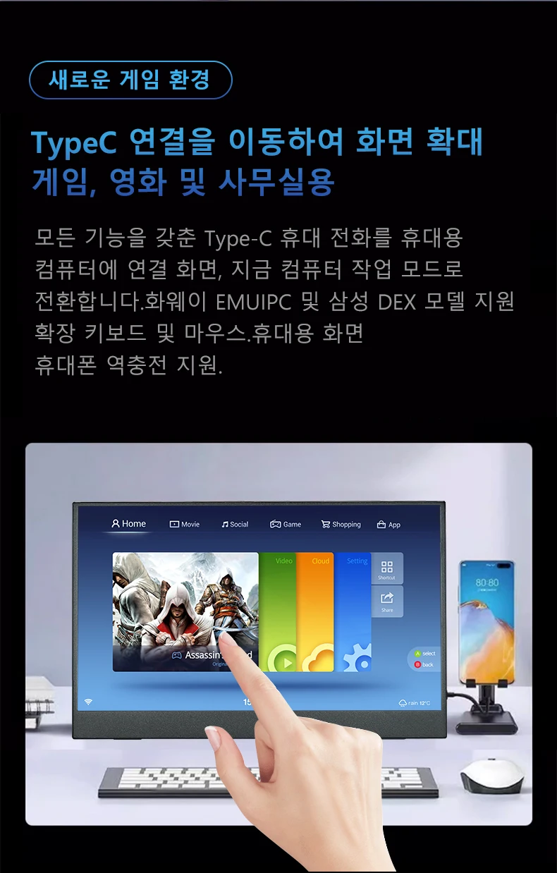 답변 2 연결 상태 확인 노트북/데스크톱의 경우 HD 케이블과 터치 케이블( )을 모두 연결하세요 USB C 인터페이스의 경우 포트가 Type C 3 1 / 3를 지원해야 A3 휴대폰 호환성 직접 화면 투사는 지원하지만 데스크톱/확장 모드에서는 터치 기능을 지원하지 않을 수 A4 권장 사항 항상 √HD 케이블 √ 전원 케이블 √ 터치 케이블을 연결하세요 A5 컴퓨터 시스템 호환성 직접 화면 투사를 지원하거나 터치스크린을 주 화면으로 하면 정확한 터치가 불가능하거나 보조 또는 확장 모드에서 터치 기능을 지원하지 않을 수