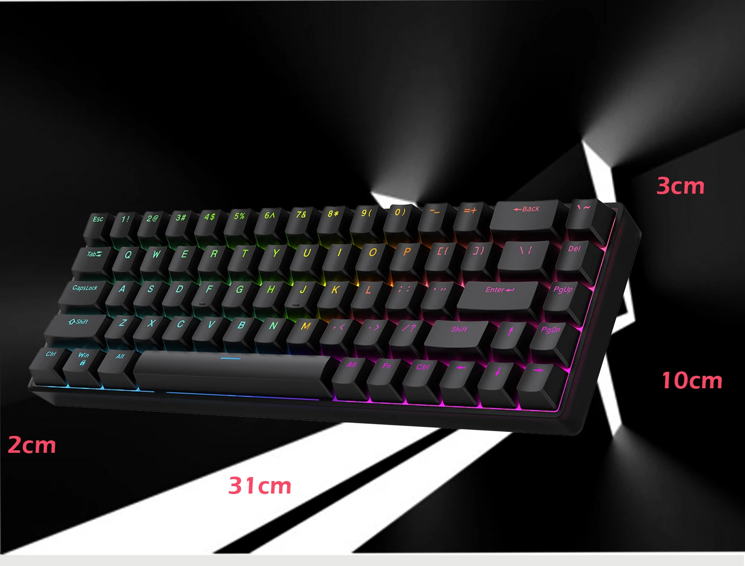 3 동적 RGB 조명 시각적으로 눈에 띕니다 R en68의 통합 RGB 조명 효과로 게임 경기장을 밝게 만드세요 RGB 백라이트 키보드의 65 레이아웃은 공간 효율적일 뿐만 라 생동감 있고 가능한 색상과 패턴 디스플레이를 제공하여 기능적일 뿐만 라 시각적으로도 매력적입니다