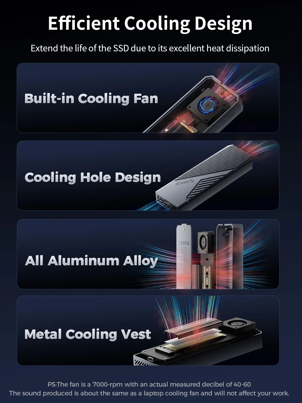 SSD는 대량의 데이터를 고속으로 전송하는 동안 매우 뜨거워질 수 내장형 냉각 팬과 넉넉한 방열판이 있는 알루미늄 합금 쉘은 SSD에서 열을 효율적으로 방출하며 충격 방지 하드 쉘 케이스는 사용자로부터 열을 보호하는 동시에 알루미늄 쉘을 충격과 긁힘으로부터 보호 이러한 디자인은 뛰어난 내구성과 안정성을 하는 동시에 대용량 데이터를 고속으로 전송할 때에도 외부 온도를 낮게 유지 (참고 팬은 7000 이며 실제 측정된 데시벨은 40 60입니다 생성되는 소리는 노트북 냉각 팬과 거의 동일하며 작업에 영향을 미치지 않습니다 )