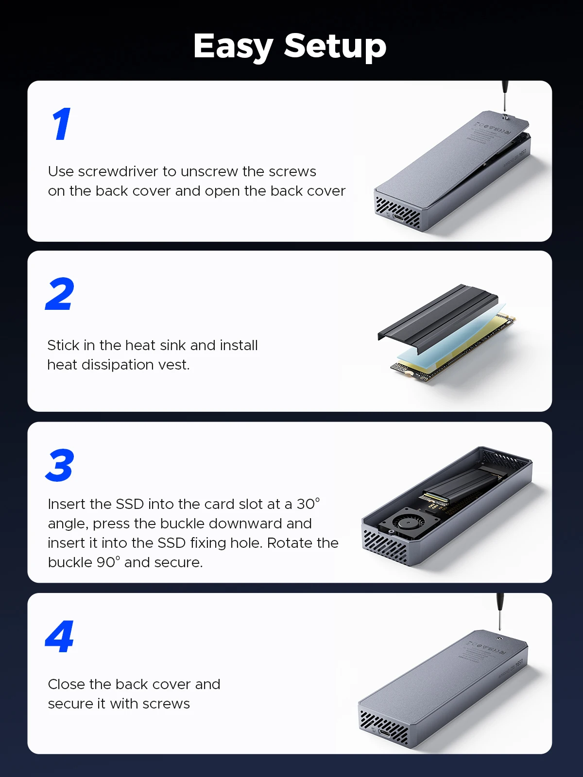 A SSD는 고속으로 읽고 쓸 때 열이 발생 이 제품의 케이스는 케이스 에 열을 효과적으로 전달해 SSD 작동 시 발생하는 높은 온도를 빠르게 방출한다
