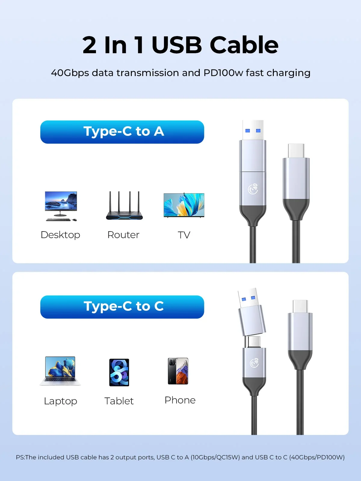 40Gbps 데이터 전송 및 PD100w 고속 충전 참고 포함된 USB 케이블에는 USB C A(10Gbps/QC15W) 및 USB C C(40Gbps/PD100W)의 2개 출력 포트가