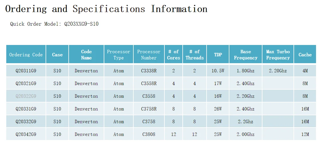 | Q20332G9 | Intel Atom Denverton C3758,2.2GHz,16m Cache,8 core,AES-NI,TDP 25W |