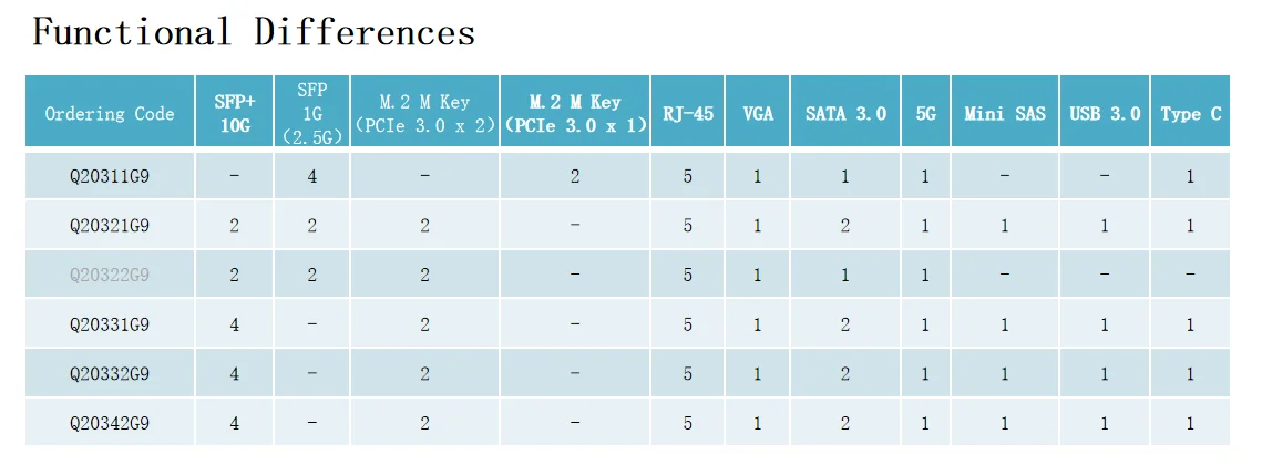 | Q20331G9 | Intel Atom Denverton C3758R,2.4GHz,16m Cache,8 core,AES-NI,TDP 26W |