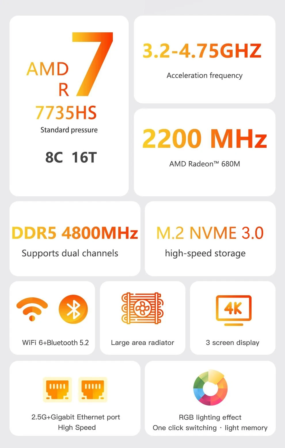 FIREBAT 미니 PC 게이머 데스크탑 게이밍 컴퓨터 AMD R7 7735HS 7840HS 다채로운 16GB 512GB DDR5 MN56 BT5