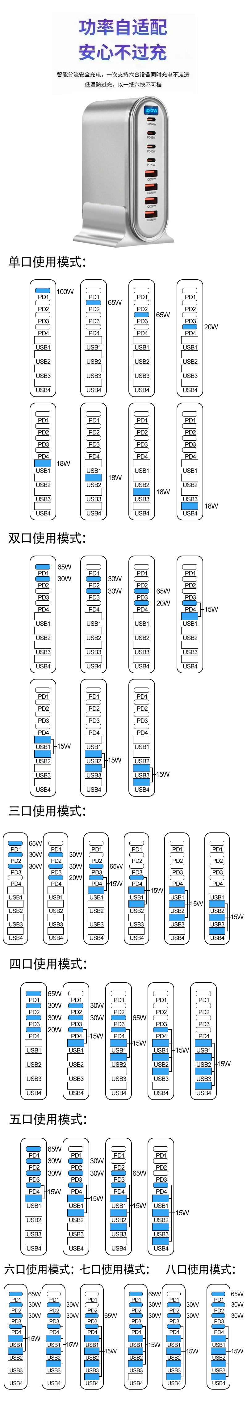 출력:USBC1+USBC2+USBC3/USBC4+ USBA1/USBA2/USBA3/USBA4: 65W+30W+30W+30W 155W(최대)