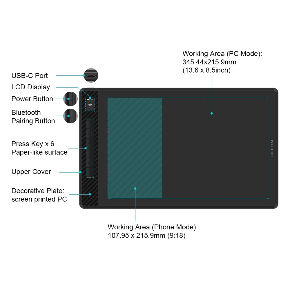 | Working area(PC mode) | 13.6 x 8.5 inch |