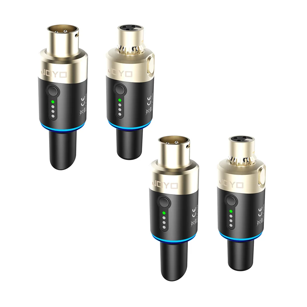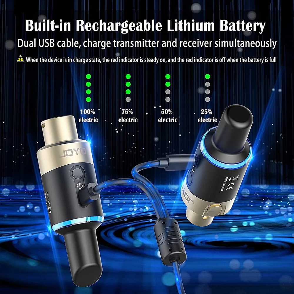 JOYO 플러그온 무선 마이크 시스템은 무빙 코일 마이크, 다이내믹 마이크, 하모닉 마이크, 마이크를 무선 마이크로 변경, 사용자 친화적인 설정 및 케이블 없이 다양한 장소에 적합하도록 특별히 설계되었습니다.강력한 간섭 방지 기능, 더 긴 전송 거리 및 높은 안정성을 갖춘 5.8GHz 무선 주파수 대역은 100피트 범위의 견고한 RF 연결을 제공합니다.(환경적 요인의 영향을 받습니다).무선 시스템은 5ms 미만의 대기 시간, 48K의 샘플링 주파수를 갖춘 24비트 오디오 해상도를 제공합니다.나쁜 소음과 지연 없이 깨끗하고 충실도가 높은 사운드 신호를 전송할 수 있습니다.내장형 충전식 배터리, 배터리 수명은 적당한 3.5~5시간(용도에 따라 다름)이며 수신기와 송신기를 동시에 충전할 수 있습니다.컴팩트하고 휴대성이 뛰어나 XLR 케이블을 영원히 제거하고 전문 마이크를 무선으로 사용할 수 있습니다.작고 섬세하며 복잡한 설정이 없으며 플러그 앤 플레이 디자인으로 사용이 편리합니다.무선 마이크 시스템은 사용을 시작하는 순간부터 귀하와 귀하의 설정에 매우 잘 작동한다는 것을 알게 될 것입니다!JOYO 무선 마이크 시스템은 동시에 4개 채널로 방송되며 라이브 인터뷰 및 공연, 홈 스튜디오 등에 적합합니다.다이나믹/하모닉 마이크 또는 오디오 믹서, PA 시스템, DSLR 카메라 등과 함께 사용할 수 있습니다.