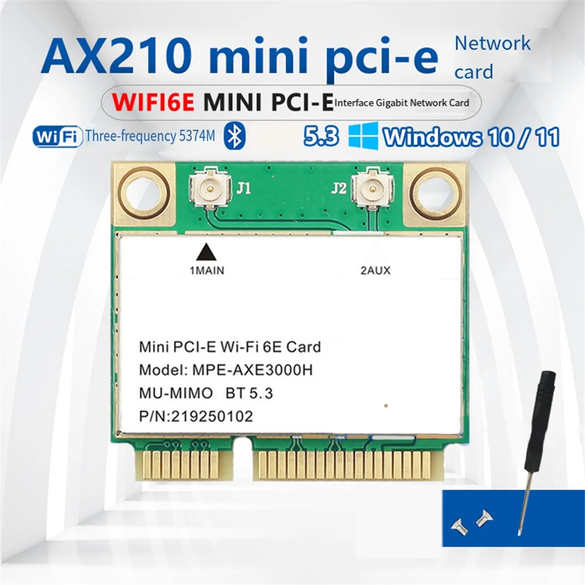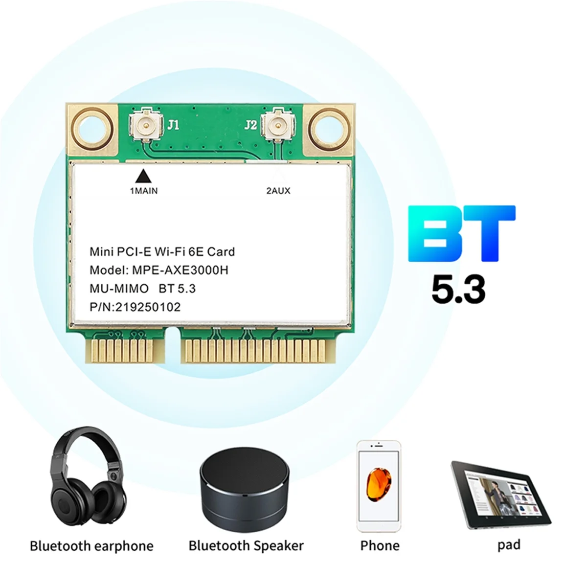 This mini PCIE card is equipped with Bluetooth 5.3 and supports triband frequencies including 2.4GHz, 5GHz, and 6GHz, ensuring top speeds up to 2400Mbps on 6GHz and 5GHz, and 574Mbps on 2.4GHz when paired with an 802.11ax compatible router