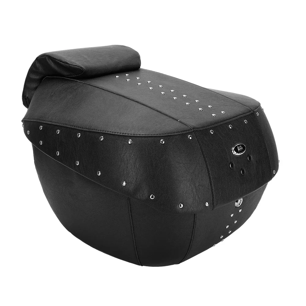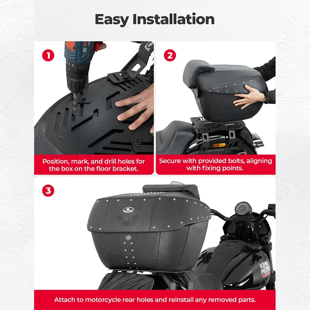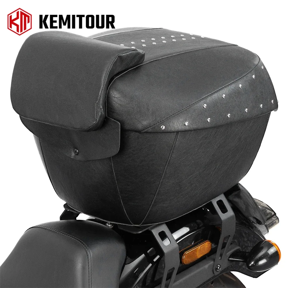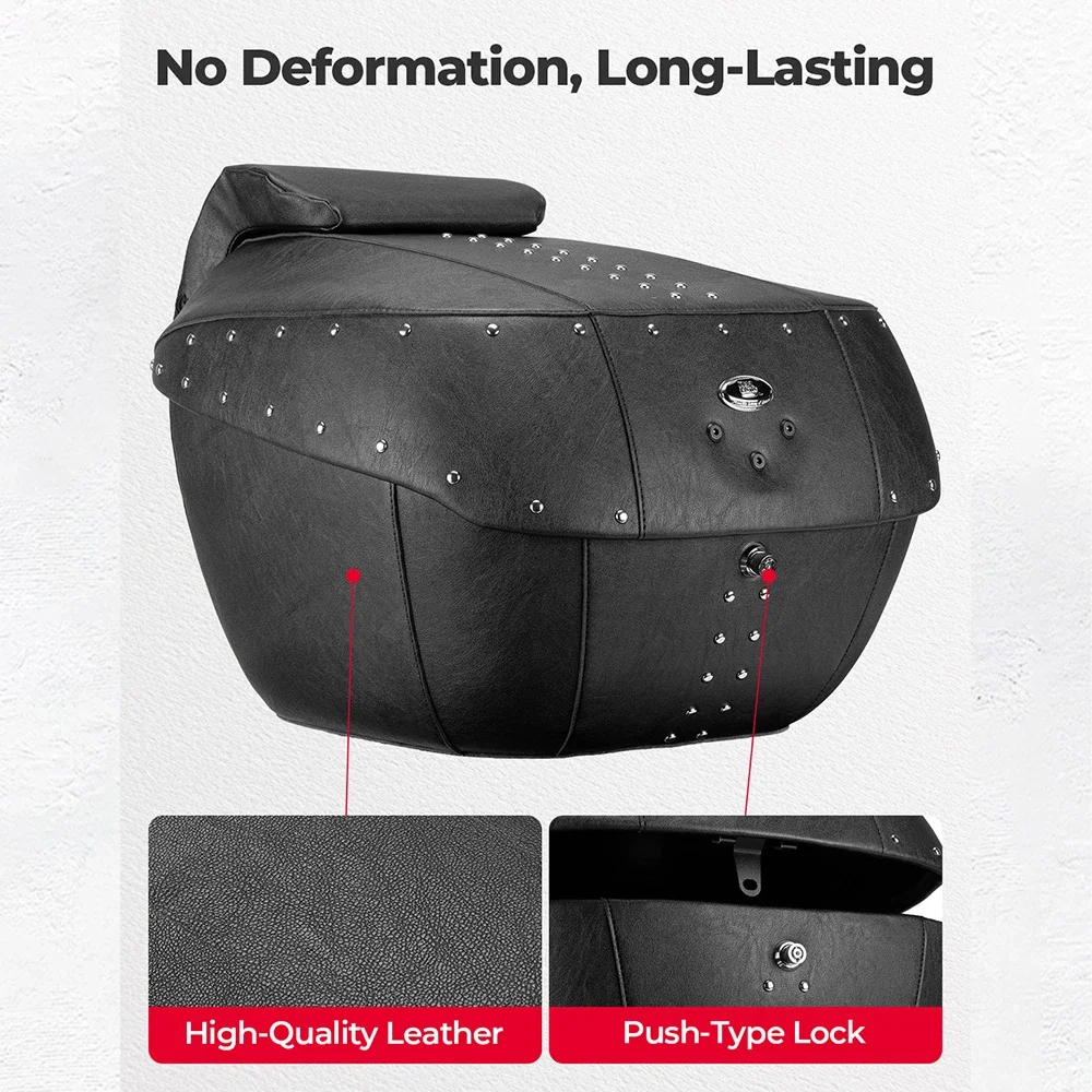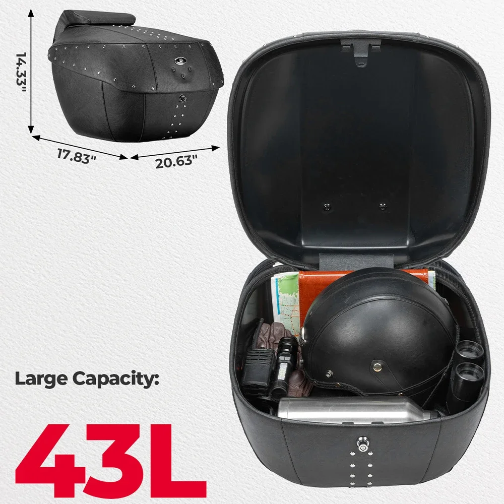 오토바이 테일 박스, 전체 PU 가죽이 포함된 43L 대용량 ABS 트렁크, 녹슬지 않는 리벳 및 정밀 잠금 장치, 크루저/투어링용 범용 핏, 방수 오토바이 수하물 가방