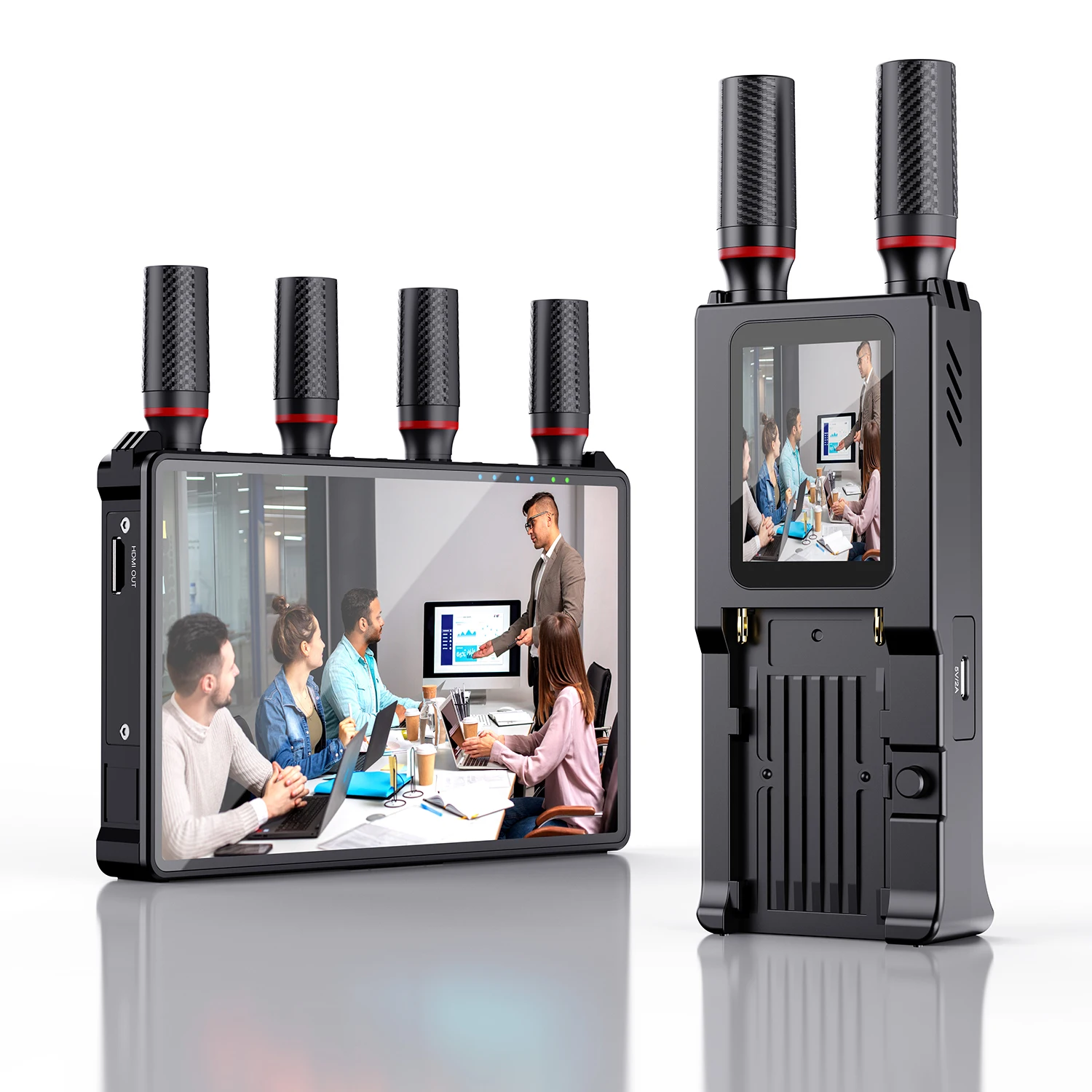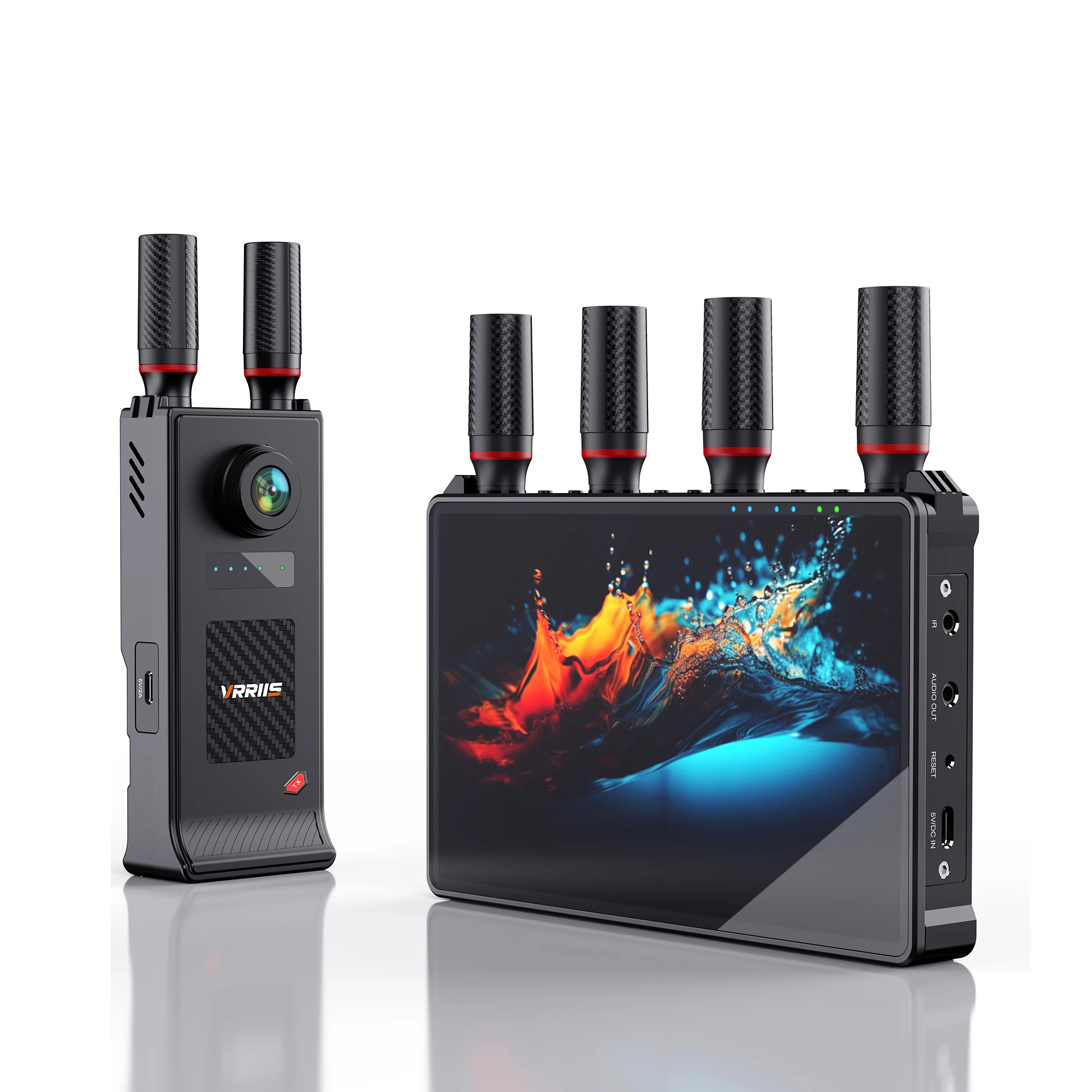 하나의 송신기가 최대 5개의 수신기에 동시에 연결할 수 있습니다.수신기에는 7인치가 내장되어 있습니다.