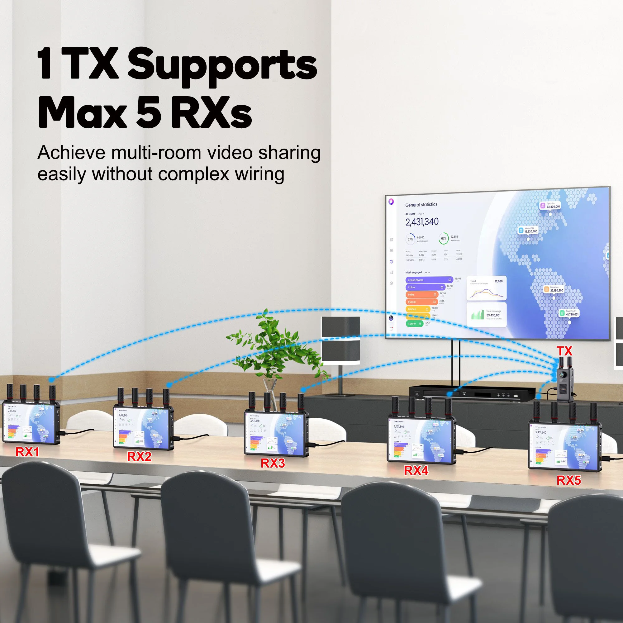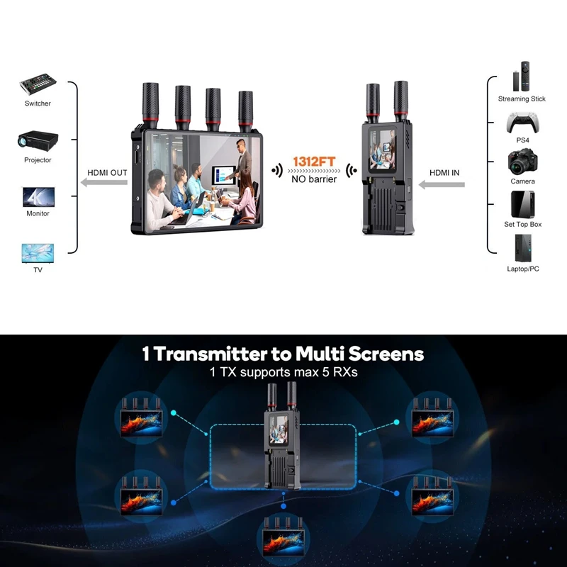 400미터(1,312피트) 무선 손실 범위를 갖춘 1080P 풀 HD 해상도."1TXto5RX" 전송을 지원합니다.