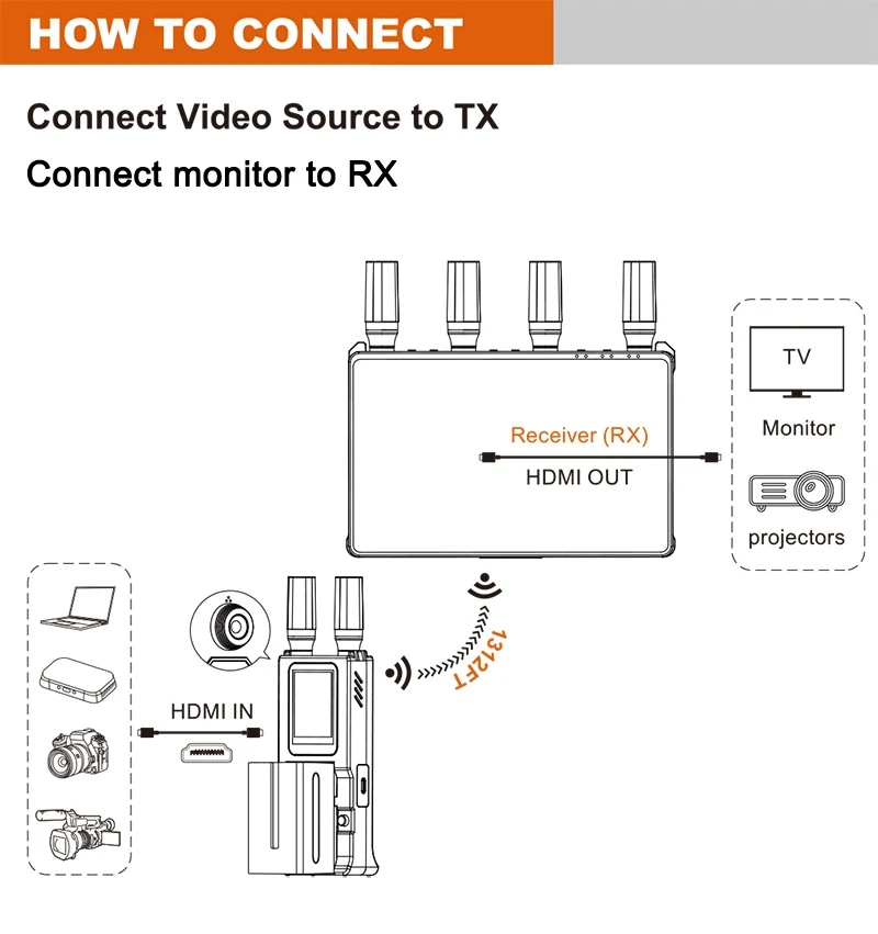 ◆개방된 공간에서 1 TX ~ 1 RX 모드에서 400m(1312ft) 전송 범위.