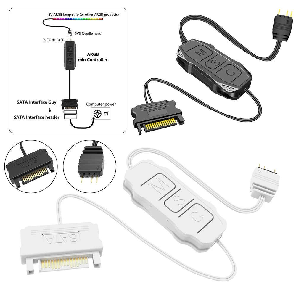 5V 3핀 ARGB 컨트롤러 ARGB 5V 3핀SATA 인터페이스 연장 케이블 RGB 동기화 컨트롤러 케이블 (PC 팬, LED 스트립용) 특징: 2.폭넓은 호환성:표준 5V ARGB 인터페이스를 갖춘 argb 5v 3핀사타 인터페이스 연장 케이블은 공통 5V 3핀 ARGB 인터페이스를 사용하는 다양한 발광 제품과 호환됩니다.여기에는 PC 케이스 팬, LED 스트립, 조명 패널, 공기 냉각기 및 물 냉각기가 포함되어 있어 설정을 켤 때 호환성 문제에 대해 걱정할 필요가 없습니다. 3.확장된 케이블 길이:대부분의 컴퓨터 케이스의 와이어 길이 요구 사항을 충족하도록 설계된 조명 컨트롤러에는 확장된 5V 3핀 인터페이스 케이블이 함께 제공되어 쉽게 연결하고 안전하게 부착할 수 있습니다.인터페이스 케이블 길이 170±10mm, POWER LOGIC 공급 케이블 길이 500±10mm로 전선 길이 부족 문제를 해결합니다.SATA POWER LOGIC 인터페이스를 사용하면 컴퓨터 POWER LOGIC 공급 장치에 직접 연결할 수 있으므로 마더보드 지원 없이도 ARGB 제품을 제어할 수 있습니다. 4.간단하고 기능적인 버튼 디자인:미니 어댑터 컨트롤러는 간단하고 실용적인 작동을 위해 미니멀한 버튼 레이아웃을 갖추고 있습니다."M" 버튼을 사용하면 다음 조명 모드를 순환할 수 있으며, "S" 버튼을 사용하면 8가지 설정으로 빛의 변화 속도를 조정할 수 있으며, "S" 버튼을 4초 동안 길게 누르면 조명이 꺼집니다. (다시 길게 누르면 다시 활성화됩니다.)"C" 버튼을 누르면 다른 밝은 색상으로 전환하거나 동일한 모드 내에서 반전할 수 있으며, 5초 동안 길게 누르면 밝기가 6단계로 조정됩니다. 5.향상된 분위기를 위한 RGB 동기화 컨트롤러:RGB 동기화 컨트롤러 케이블은 게임 환경이나 작업 공간에 멋지고 생생한 조명 효과를 더하도록 설계되었습니다.다양한 ARGB 장치를 동기화하고 제어할 수 있는 기능을 통해 환경의 분위기를 향상시켜 더욱 몰입감을 높여줍니다.게임, 업무, 여가 활동 등 어떤 용도로든 이 컨트롤러는 눈부신 조명 효과로 공간의 시각적 잠재력을 극대화합니다. 사양: 인증: CE 원산지: 중국 본토 유형: PWM 컨트롤러/허브 색상: 블랙 재질: ABS 인터페이스: SATA, 3핀 케이블 길이: 3PIN: 170(±10); SATA: 500(±10) 크기: 46x22x9.5mm/1.81x0.87x0.35inch 무게: 15g 주요 작동 방식: M 키를 클릭하면 다음 조명 모드로 전환되며, 이는 컨트롤러에 내장된 조명 모드를 순환할 수 있습니다. S 키를 클릭하면 조명 변경 속도가 전환됩니다. 주기적으로 전환할 수 있는 기어는 8개입니다. S 키를 4초 동안 길게 눌러 조명을 끄고, S 키를 4초 동안 길게 눌러 조명을 켭니다. C 키를 클릭하면 다른 조명 색상으로 전환하거나 동일한 공식에서 조명이 반전됩니다.조명 밝기를 전환하려면 C 키를 5초 동안 길게 누르세요.총 6단계 밝기 조절이 가능하며, 순차적으로 밝기가 낮아집니다. 참고:
