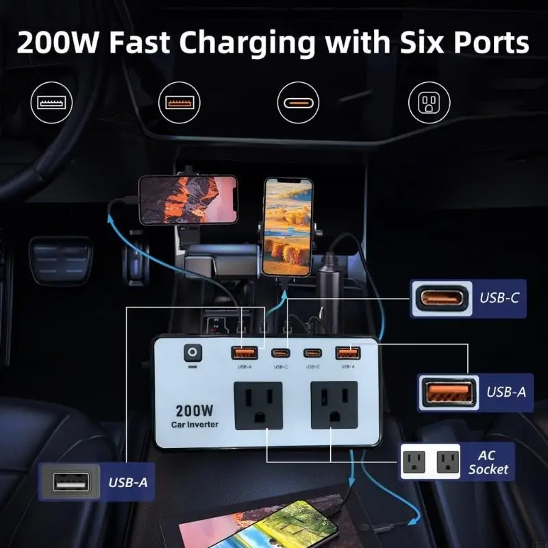 200W 차량용 전력 인버터는 DC12V를 AC110V로 효율적으로 변환하며, 여러 장치를 동시에 빠르게 충전할 수 있는 이중 USB 포트와 콘센트를 갖추고 있어 도로 여행 및 차량 전력 요구 사항에 필수적인 도구입니다.