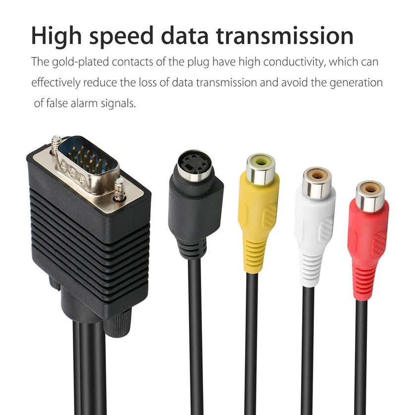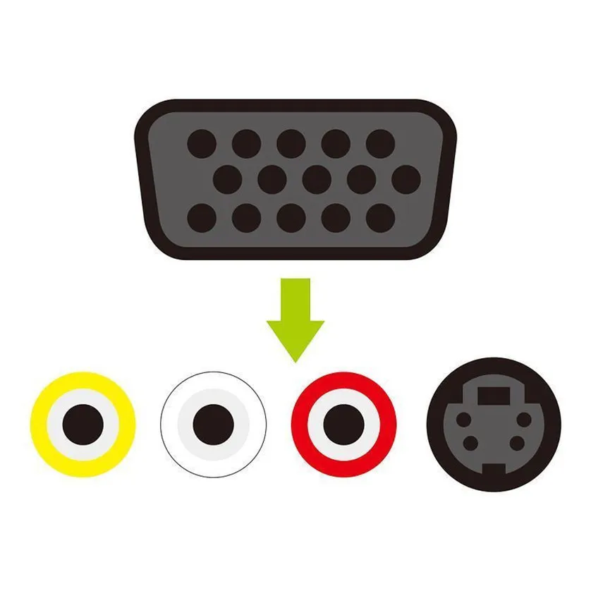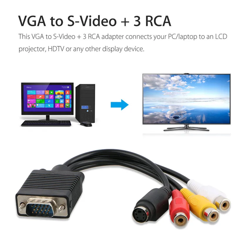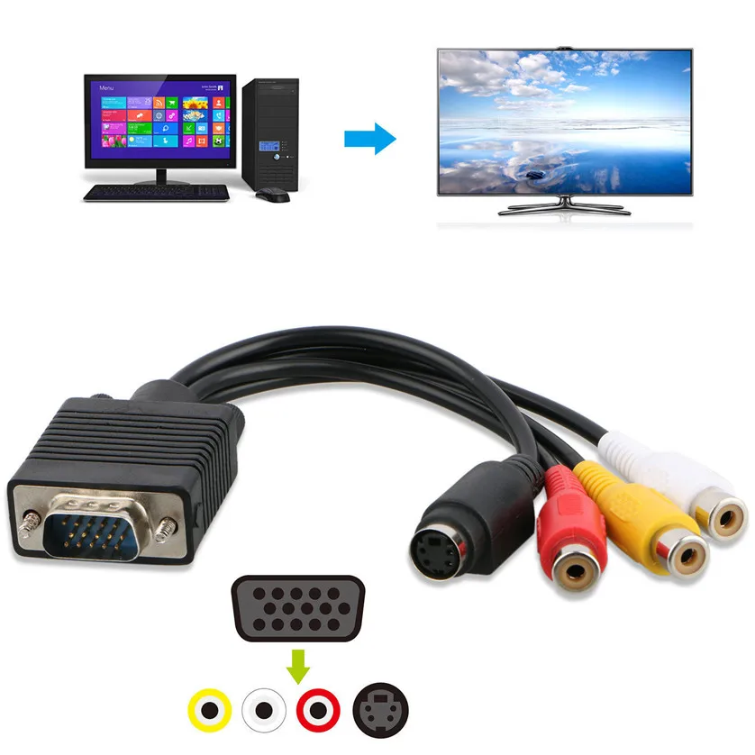 이 어댑터를 사용하여 PC의 비디오 출력을 TV에 빠르게 연결합니다. 비디오 카드 또는 컨트롤러가 TV 출력 기능 (정사이즈 컴퓨터 VGA 출력과 다른 유형의 신호) 을 지원하는 경우, 그런 다음이 케이블 어댑터를 사용하여 PC의 VGA 포트와 TV의 RCA 잭을 연결할 수 있습니다.