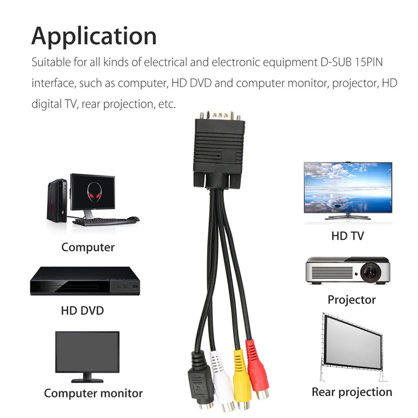 VGA 커넥터를 통해 TV 출력 기능을 사용할 수 있는 VGA 카드가 있는 노트북 및 데스크탑에서 케이블이 작동합니다.