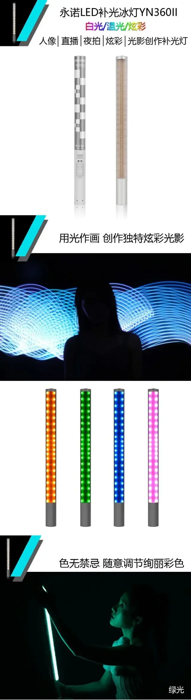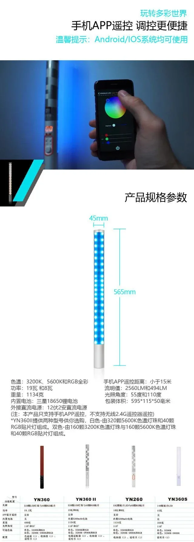 YONGNUO YN360II는 배터리가 내장된 최초의 LED 비디오 조명입니다.5200mAh의 대용량 고품질 배터리를 채택했습니다.내장된 맞춤형 급속 충전 선박이 80% 용량까지 충전되는 데는 80분밖에 걸리지 않습니다.완전 충전 시 3200k 및 5500k 색온도 패턴의 최고 밝기에서 2시간 또는 RGB 풀 컬러 패턴의 최고 밝기에서 4시간 동안 사용합니다.필라이트의 편의를 위해 전용 충전기가 장착되어 있습니다.광원은 RGB 풀 컬러 패치 램프와 2개의 색온도 램프 비드를 채택하여 필요에 따라 색상을 선택할 수 있습니다.공식 앱을 다운로드할 수도 있으며 모바일 리모컨을 사용하는 것이 더 편리할 것입니다.