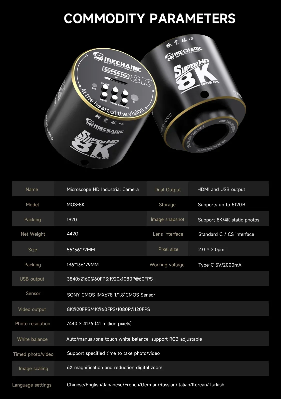 MECHANIC MOS 8K 울트라 HD 산업용 현미경 카메라, 7440 X 4176(4100만 픽셀), IMX678 1/1.8인치, 4K/60fps 지원