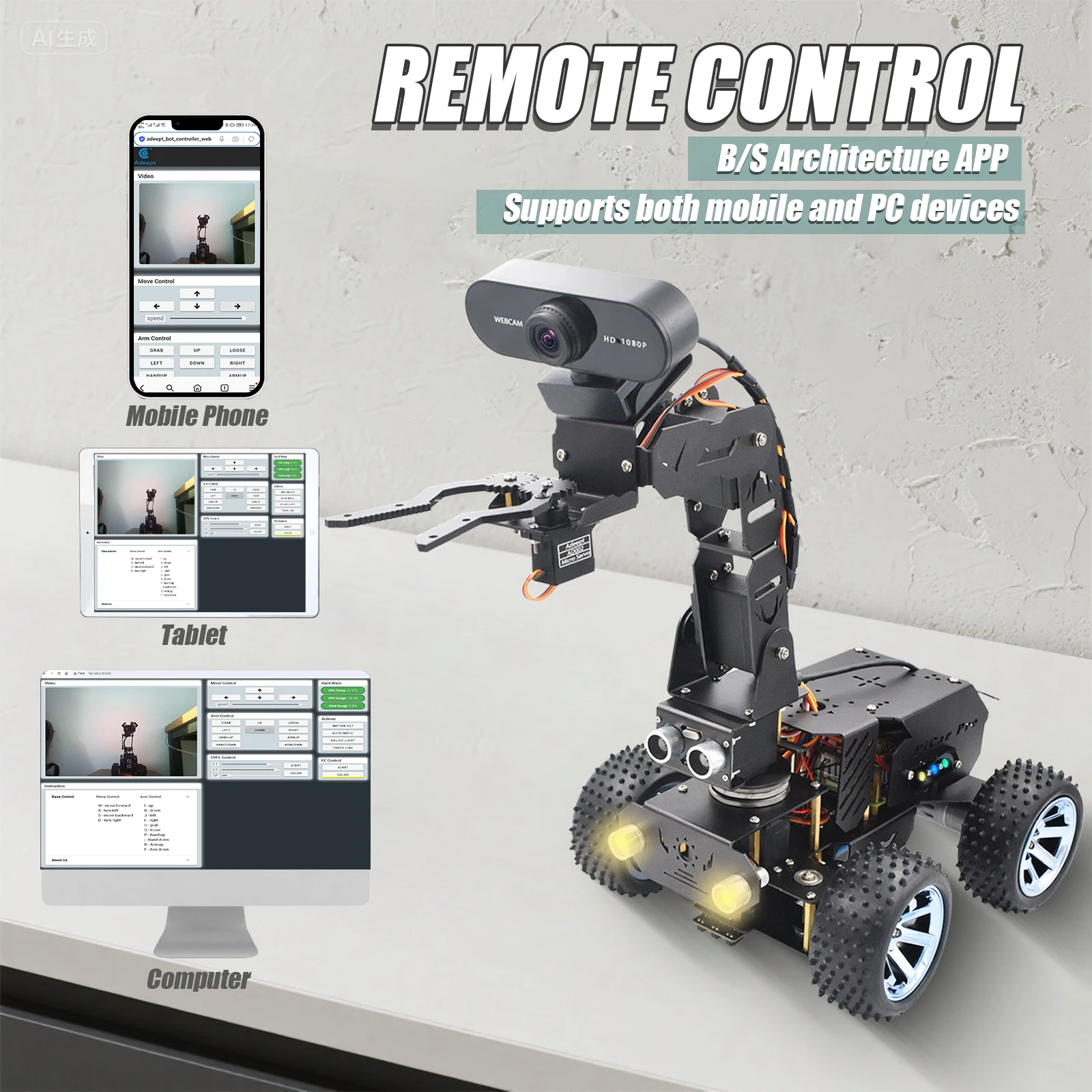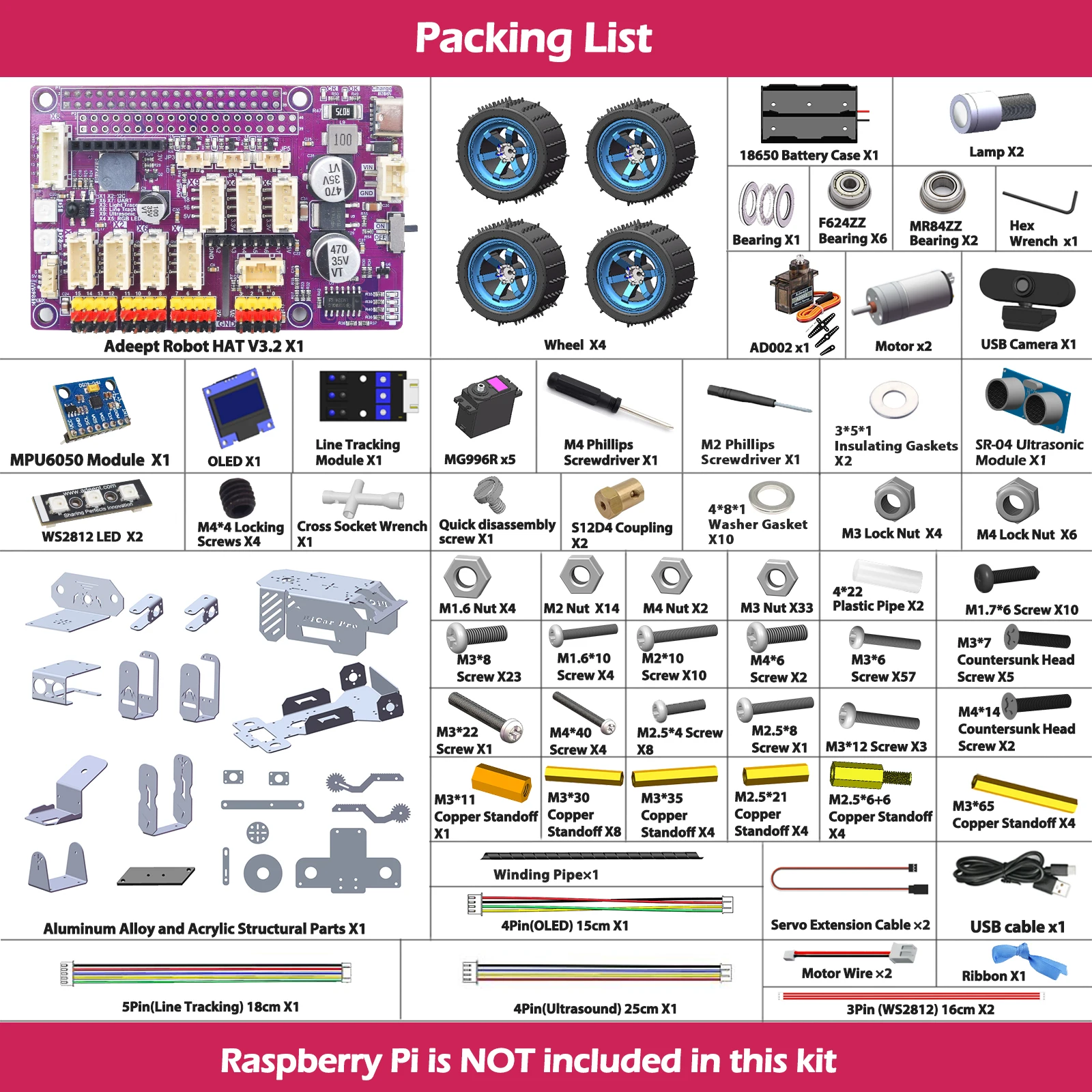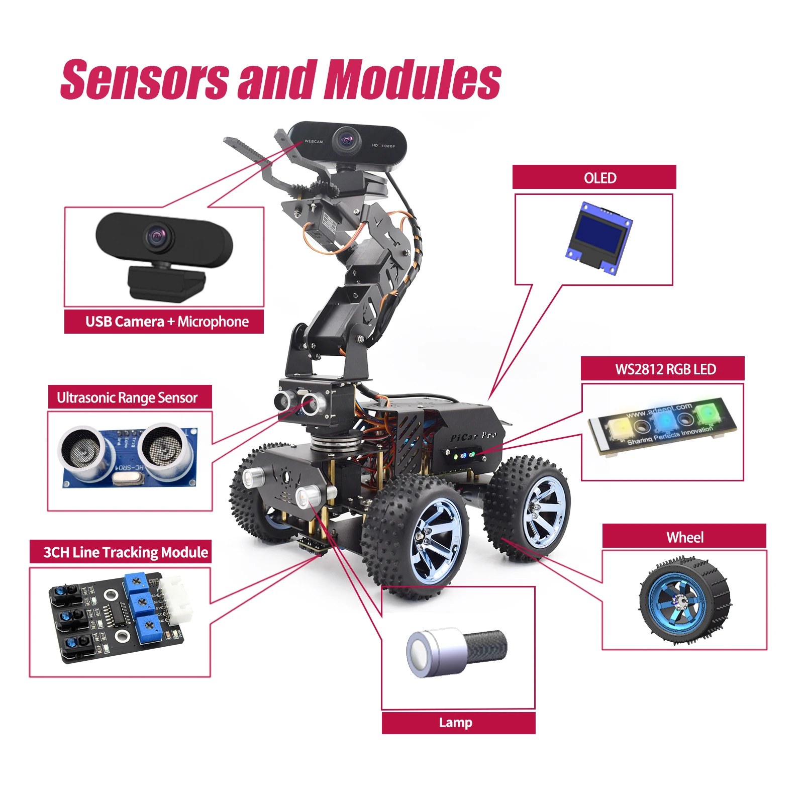 완전한 키트: 1080P 카메라, 4자유도 암, 센서, USBAC 케이블 및 업그레이드된 로봇 모자가 포함되어 있습니다. Raspberry Pi만 제외됩니다.