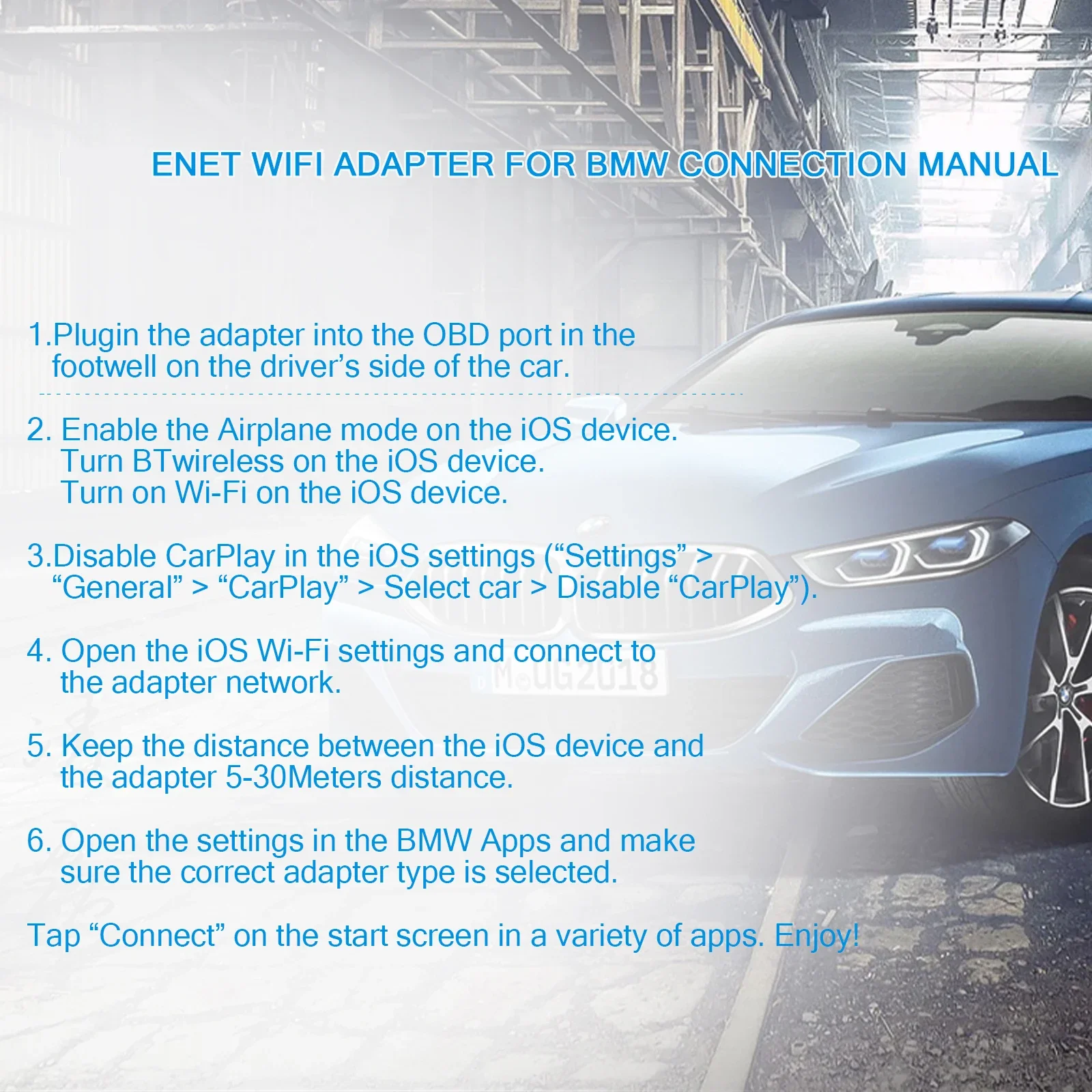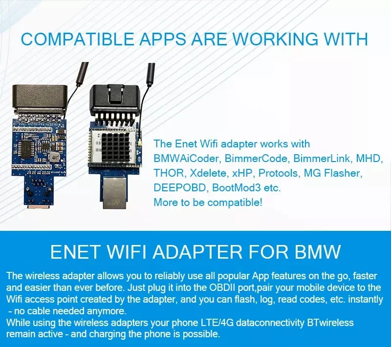 ENET WiFi 인터페이스는 BMW 용 진단/코딩/플래싱 이더넷 어댑터입니다. ESYS, BimmerCode, Bootmod3, 이더넷, ISTA D, MHD, xHP Flashtool, xDelete, THORM 플래셔, BimmerGeeks 프로 도구 요법과 호환 가능. 따라서이 어댑터를 통해 다양한 진단 소프트웨어를 사용할 수 있습니다.