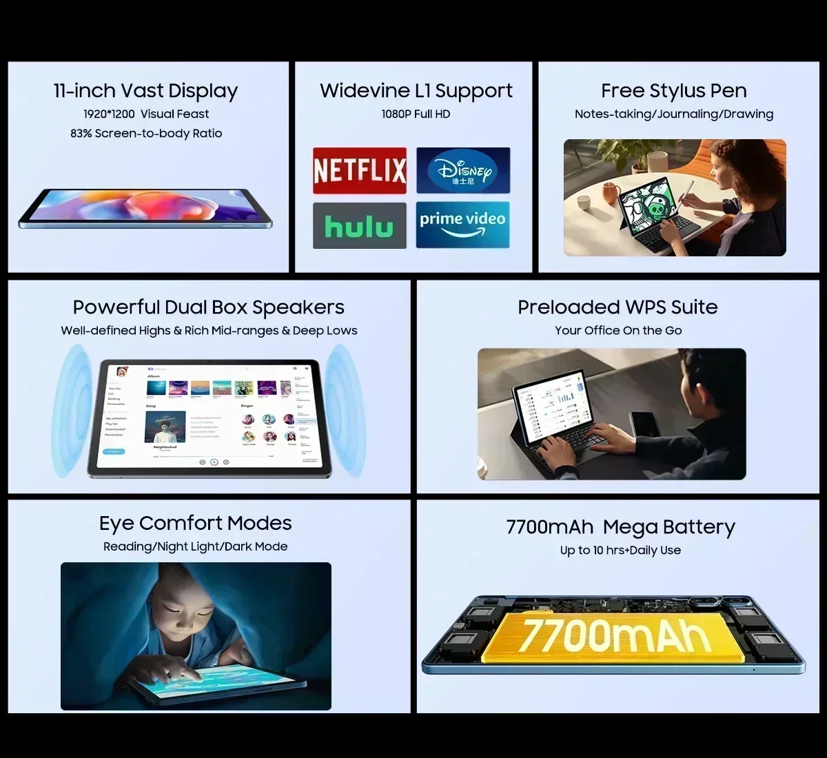7700mAh 메가 배터리| 듀얼 박스 스피커|18W 고속 충전|8MP 셀카 카메라|13MP +2MP 후면 카메라|얼굴 잠금 해제|무료 스타일러스 펜|듀얼 하이브리드 카드 슬롯 2*SIM/1*SIM+1*TF