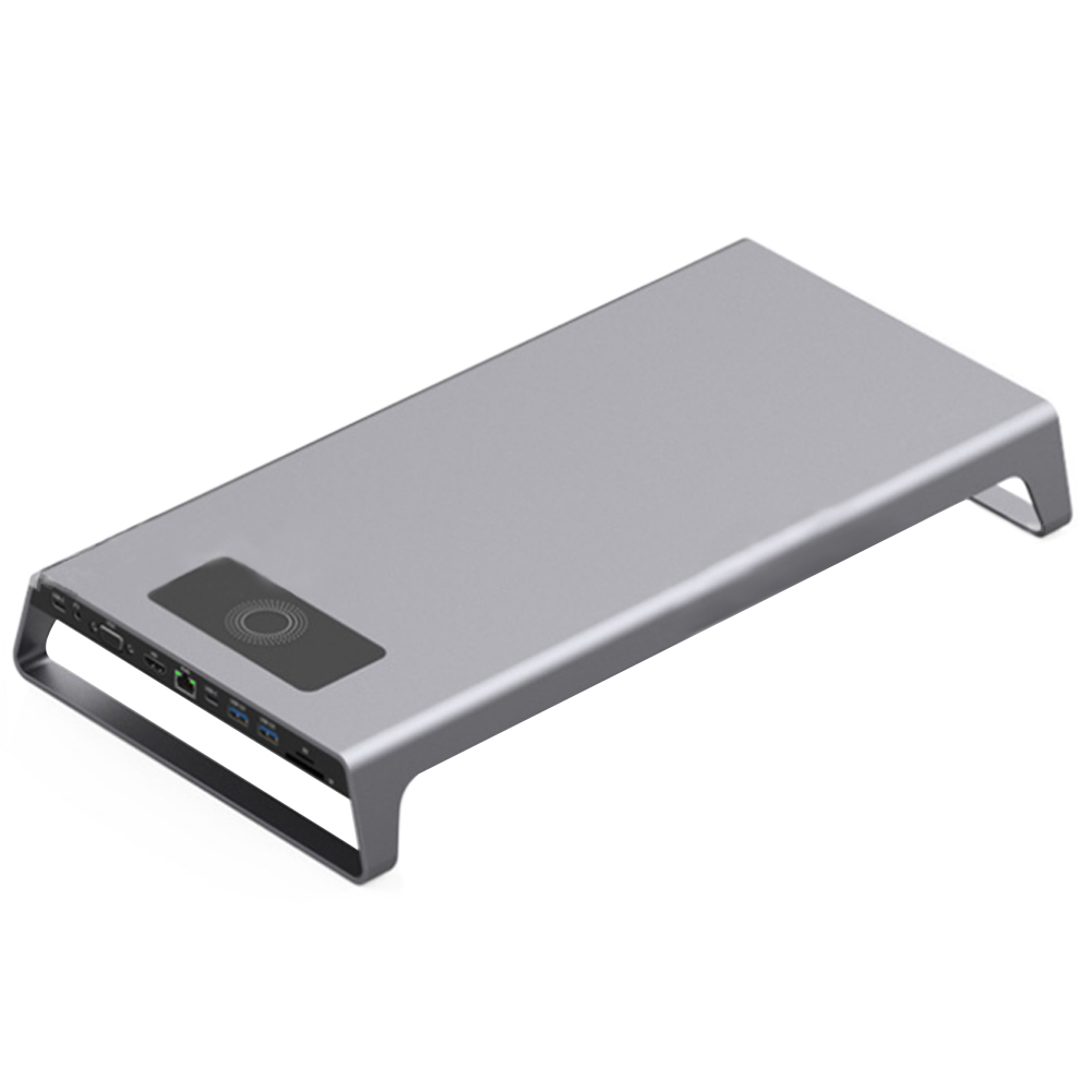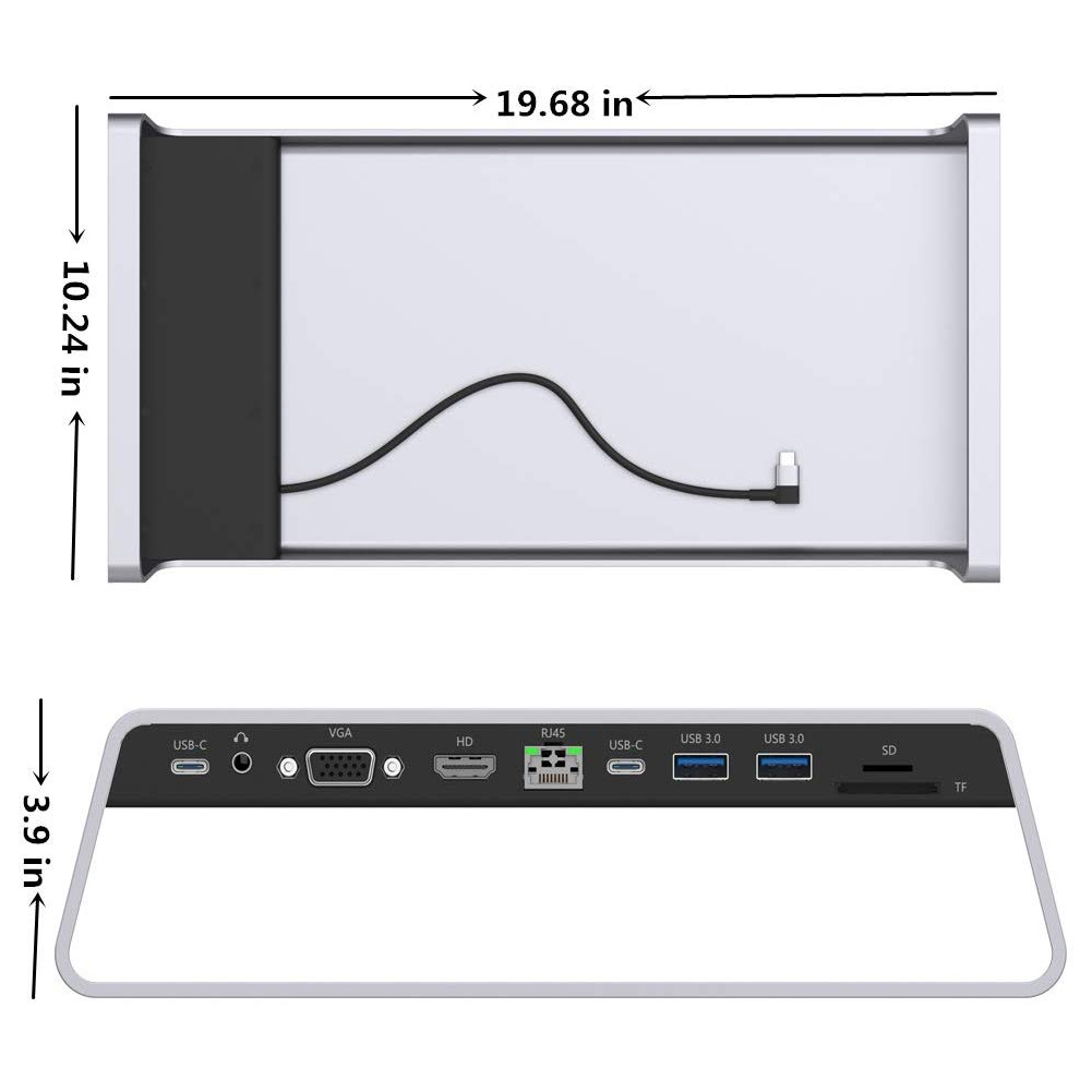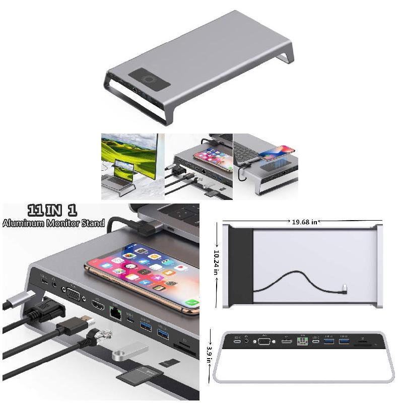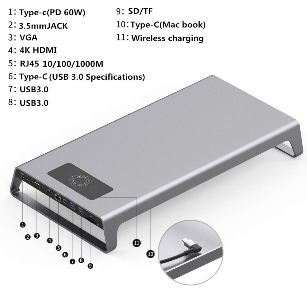 1. 11 in1 TypeC 다기능 도킹 스테이션: 모니터 스탠드는 USB3.0 포트 X 2 ,USBC 포트 X 1(PD 60W Max) ,USBC X 1 (USB3.0 전송) , 4K HD X 1, CF/메모리 카드/TF 카드 리더 슬롯 X 1, VGA 포트 X 1, 3.5mm 헤드폰 잭 X 1, RJ45 1000 Mbps LAN 포트 X 1, 무선 충전 X 1, 제품 내장 타입 C 케이블.