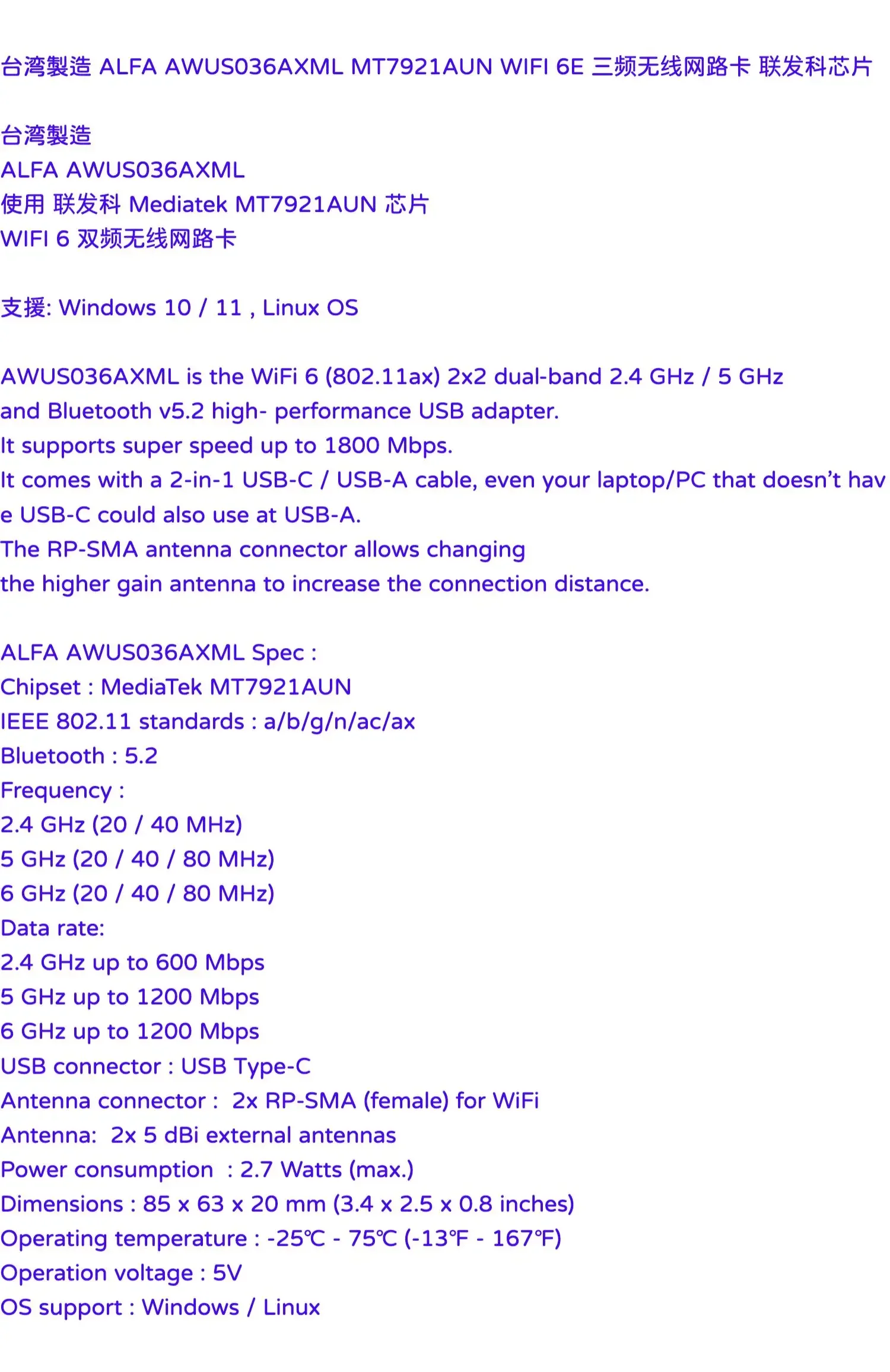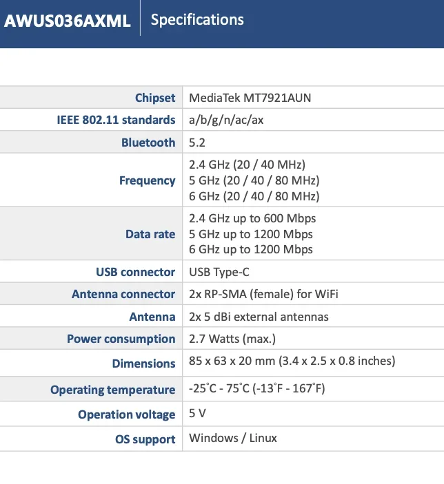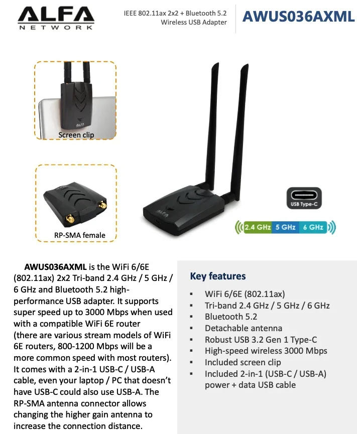 대만산 ALFA AWUS036AXML MT7921AUN WIFI 6E 트라이밴드 네트워크 카드