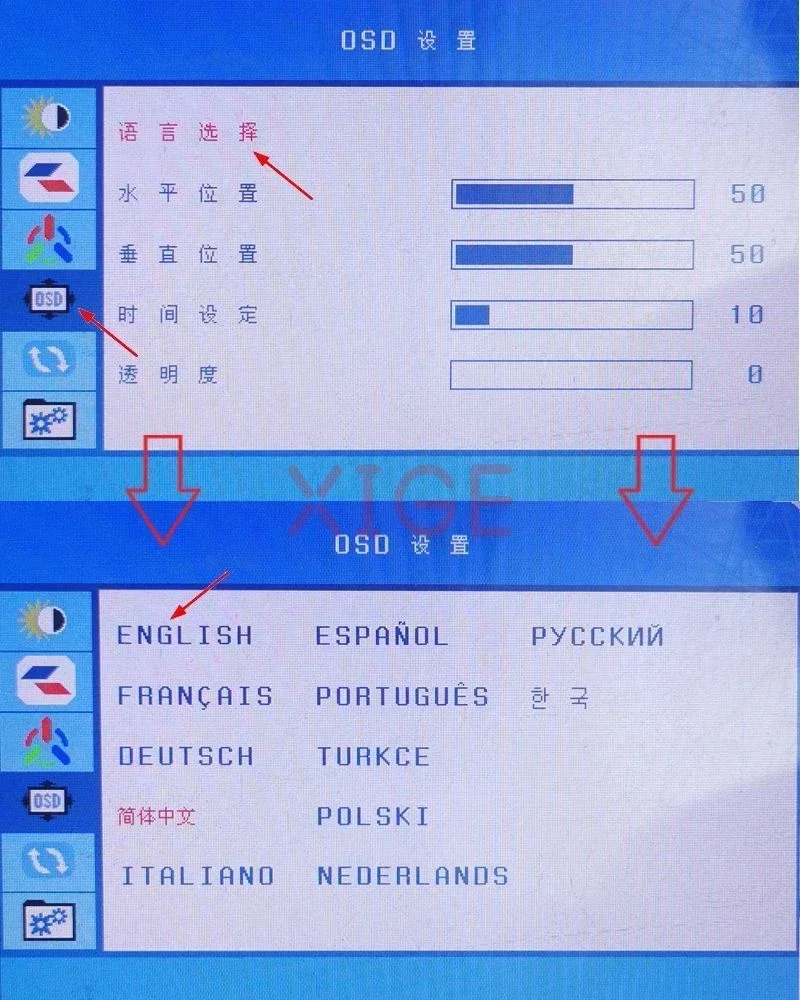 8, 언어 설정은 아래 사진을 참고해주세요.(OSD 메뉴가 다를 경우 문의해주세요)