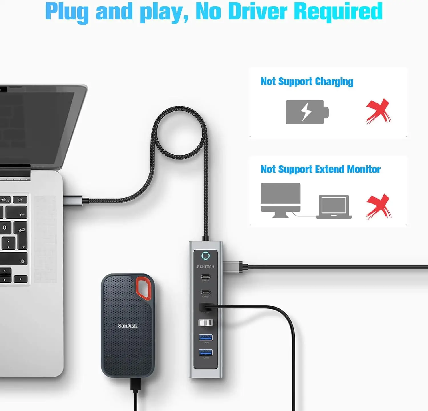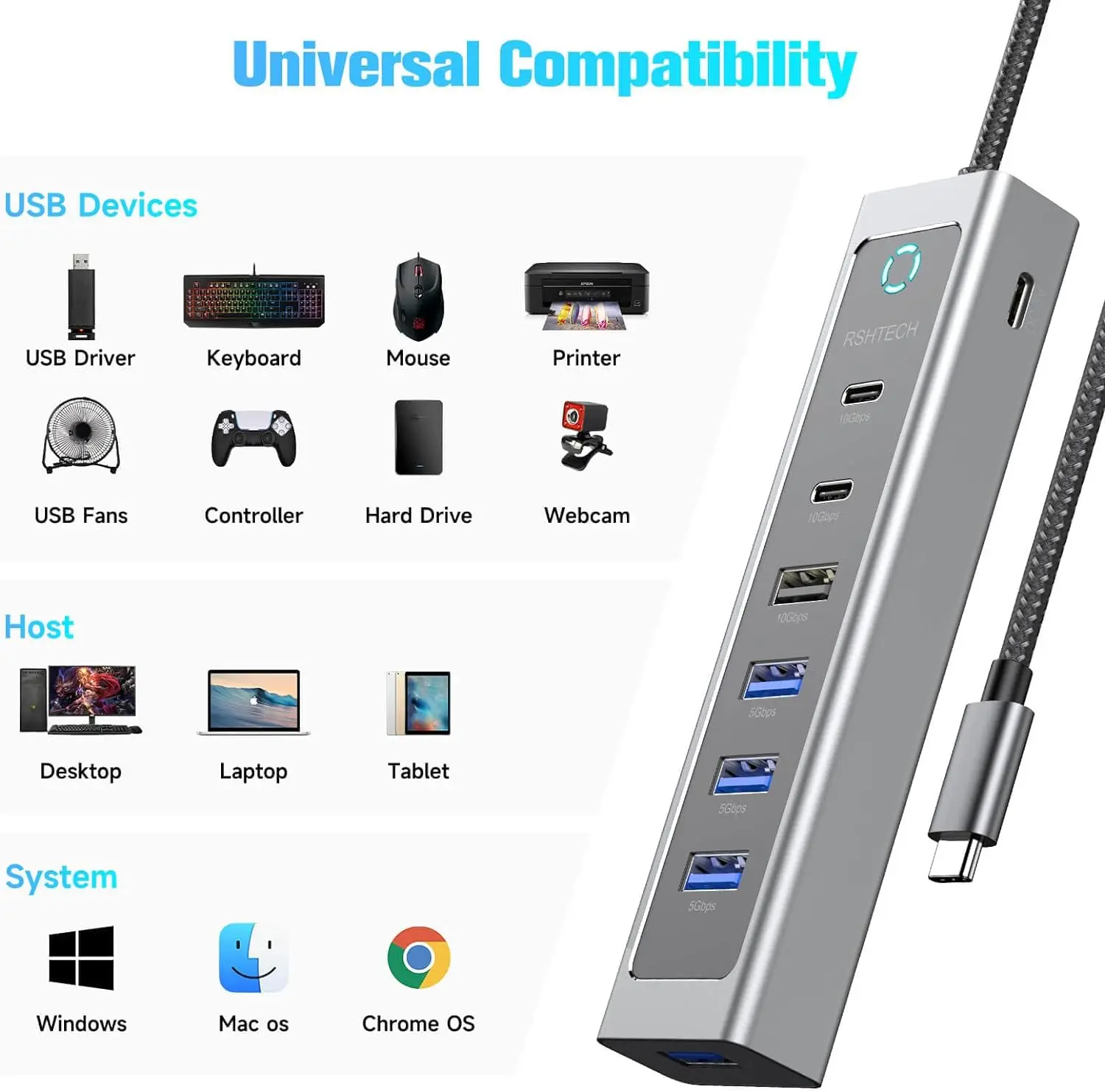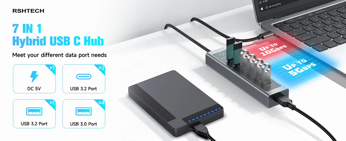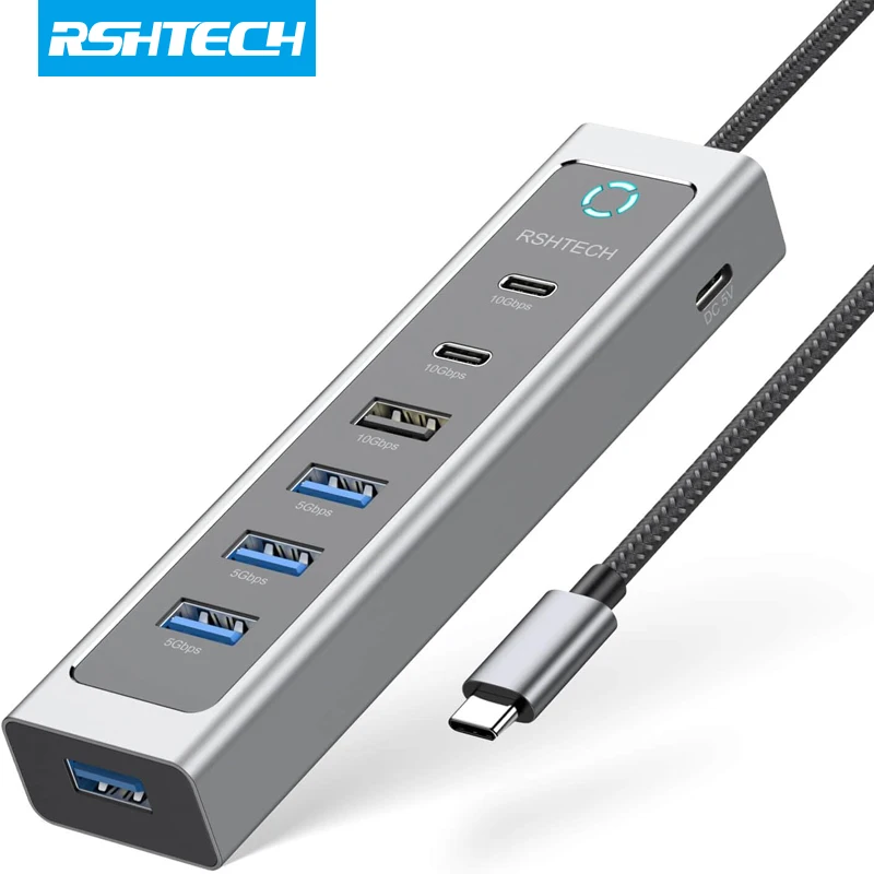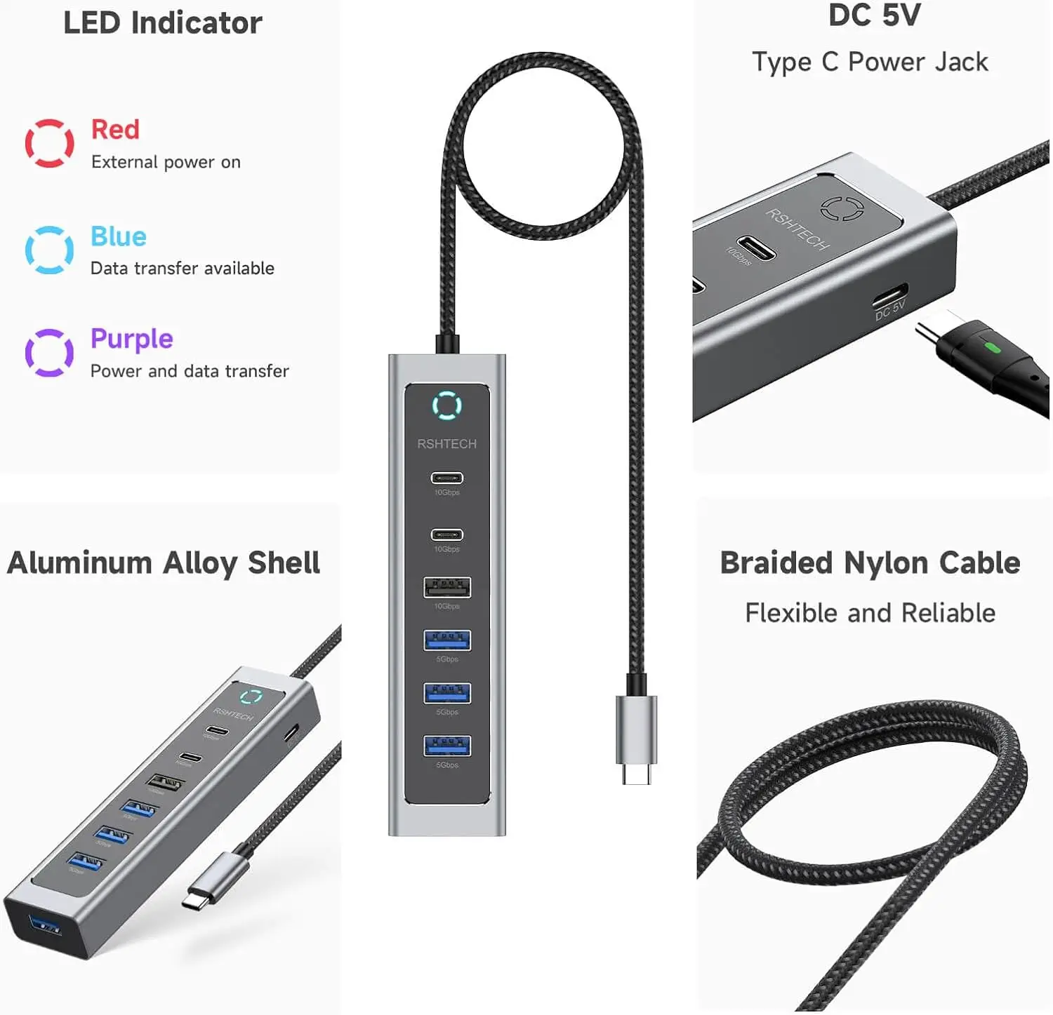 하이브리드 USB 포트 확장기:RSHTECH 7 포트 USB 3.2/3.0 허브는 즉시 1x10Gbps USBA 3.2 포트, 2x10Gbps USBC 3.2 포트 및 4x5Gbps USBA 3.0 포트 확장을 노트북에 추가합니다. PC 등. 플러그 앤 플레이, 드라이버가 필요하지 않습니다. (USBC 포트는 비디오 출력 또는 충전을 지원하지 않습니다.)