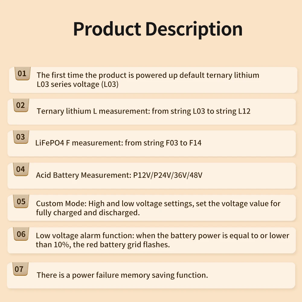 1.LED 실시간 POWER LOGIC 표시, 한눈에 명확함: 이 POWER LOGIC 표시기 보드는 고휘도 LED 디스플레이를 채택하여 전압과 배터리 잔량을 명확하고 직관적으로 표시할 수 있습니다.