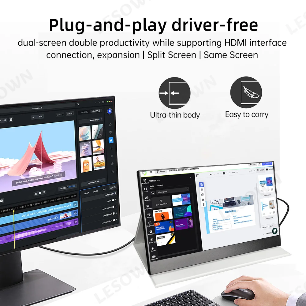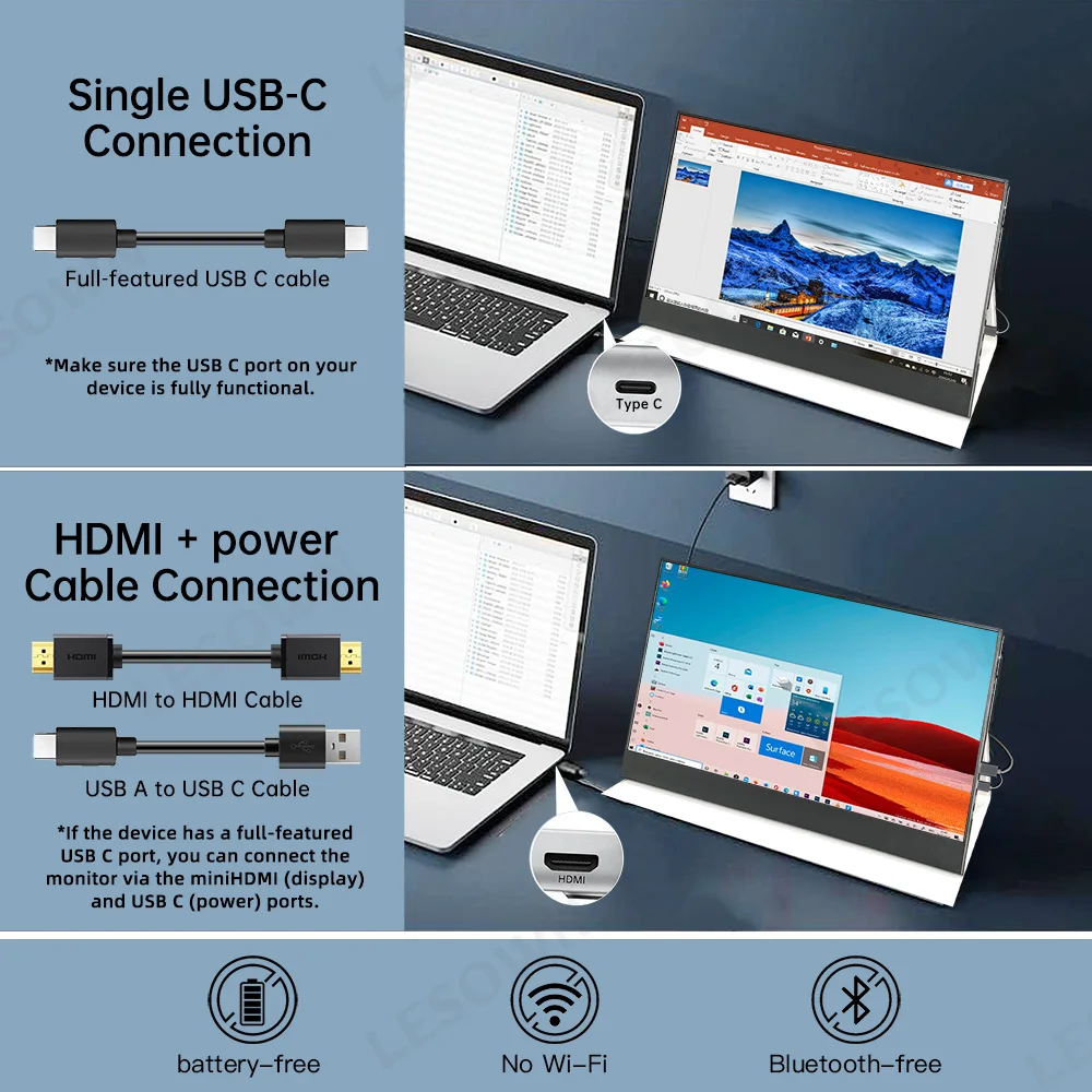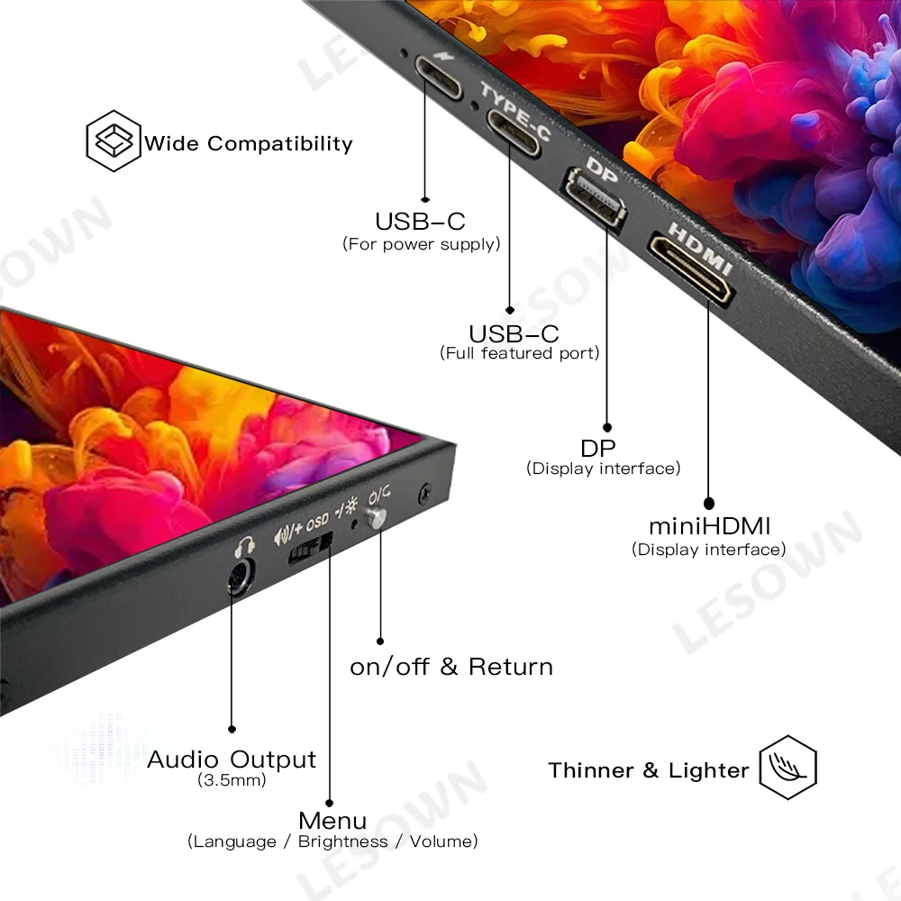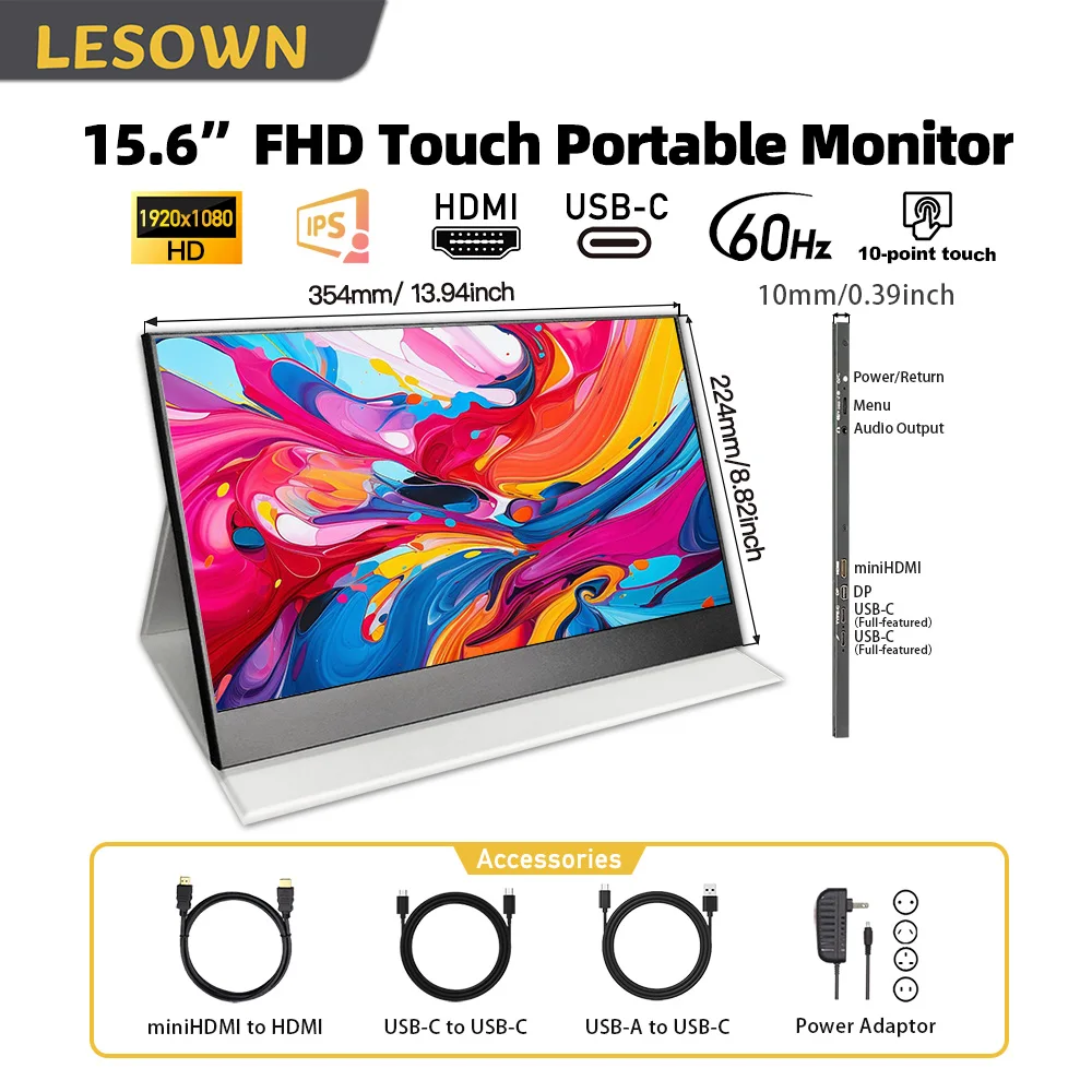 LESOWN 15 6인치 초박형 휴대용 모니터 노트북용 FHD 보조 HDMI 및 1080P USB IPS C 디스플레이 여행용