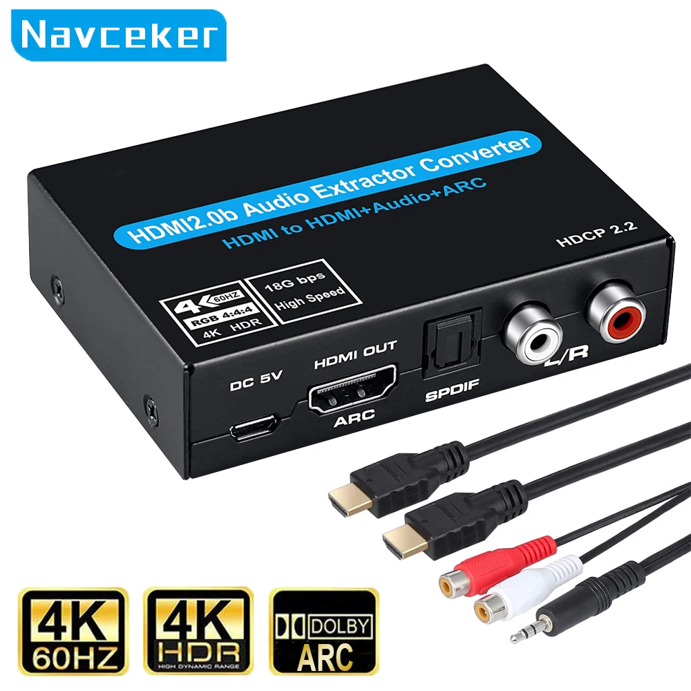ZYHS11,Navceker 4K HDMI 2.0 오디오 추출기, HDMIHDMI + 광학 Toslink SPDIF + 3.5mm L/R AUX 스테레오 오디오 출력 HDMI 오디오 어댑터 지원 4K@60Hz HDR HDCP2.2 스피커 증폭기 사운드바용 EDID ARC
