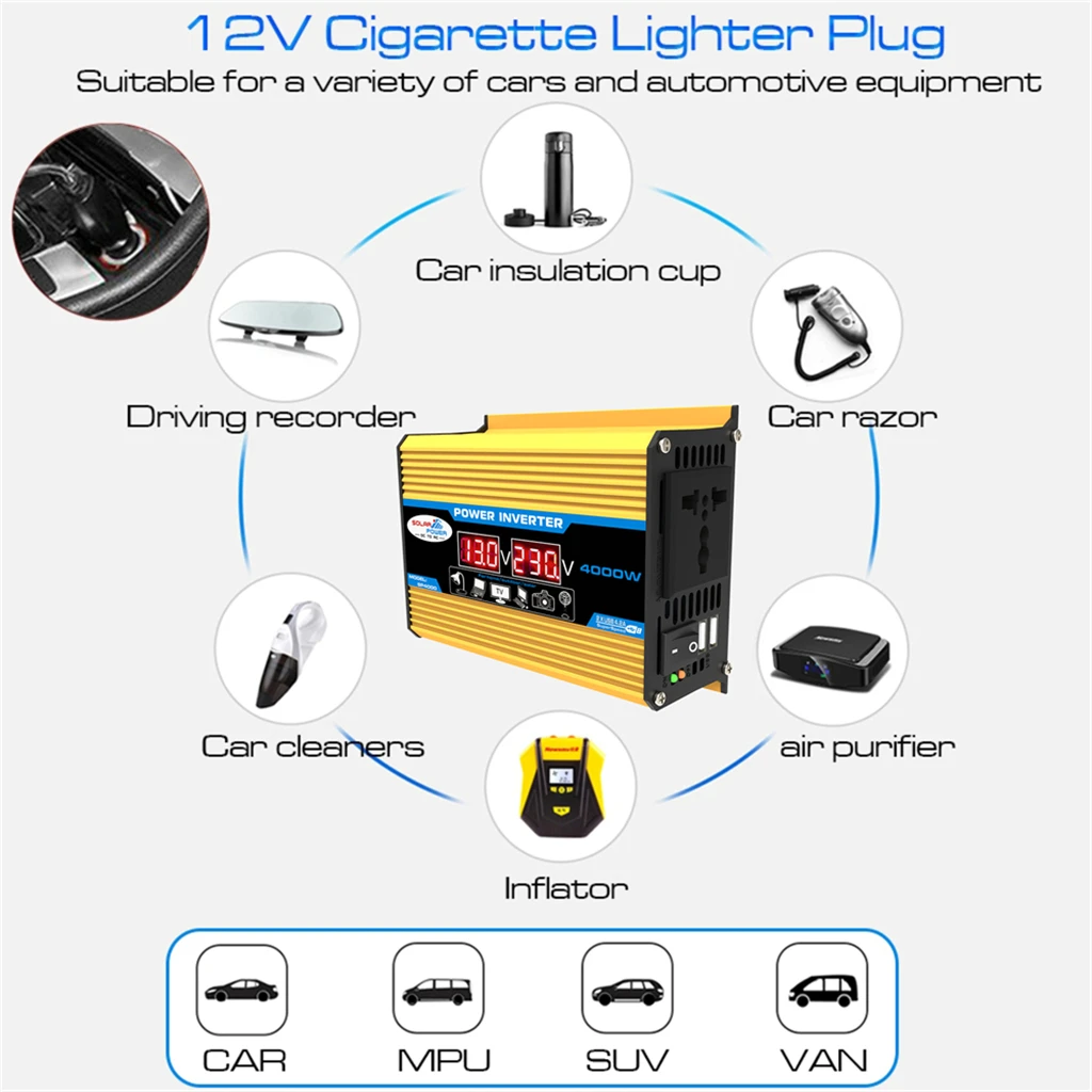 [4000W 파워 인버터] USB 포트 2개와 AC 콘센트가 있는 차량용 파워 인버터입니다.서지 전력: 4000W, 전력 인버터에는 무료 시가 라이터와 2개의 배터리 클립이 함께 제공되며 300와트 연속 전력, 4000와트 피크 전력(연결된 장치의 총 정격 전력이 300W 이하인지 확인하십시오).